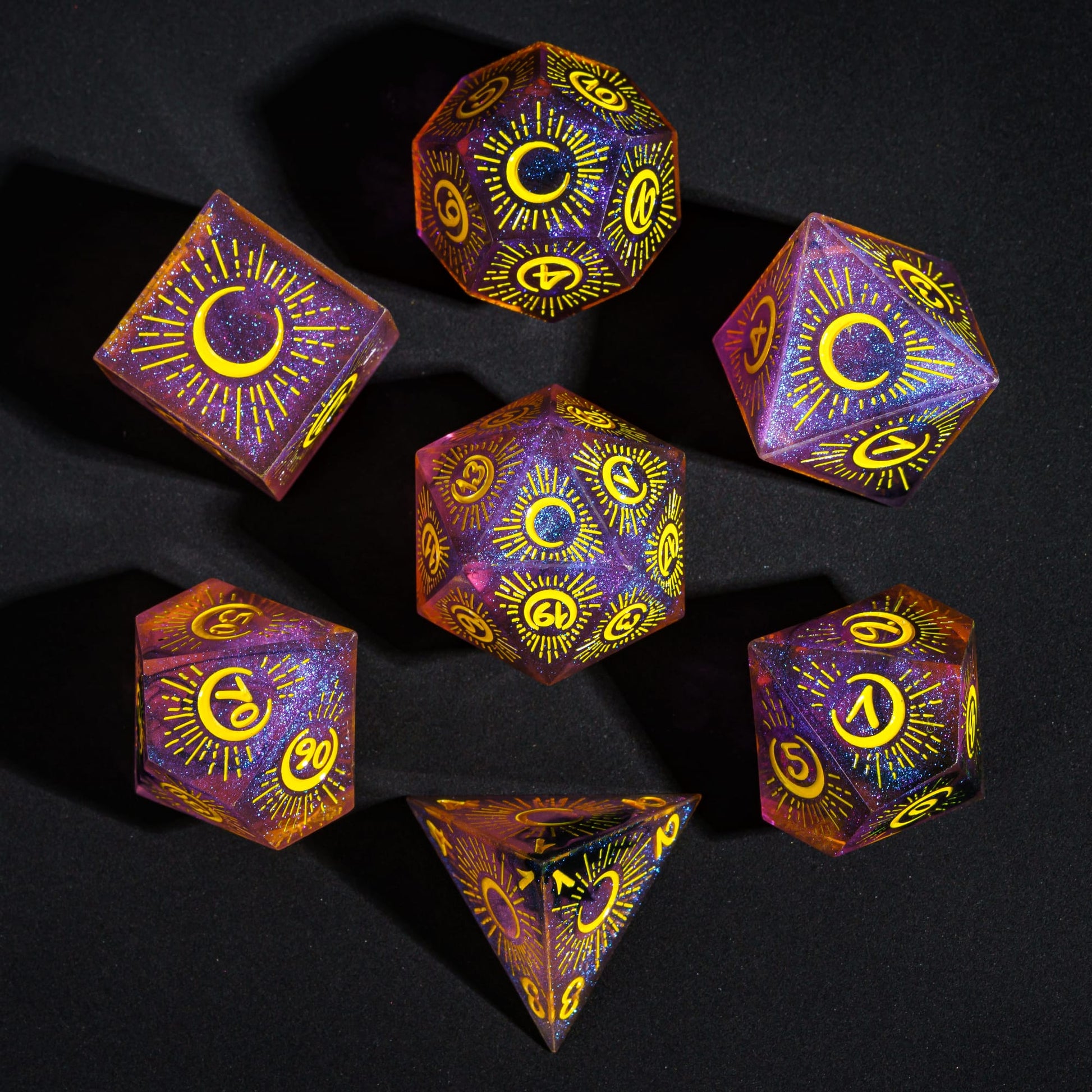 Laat je spel verlichten door de magie van de nachtelijke hemel met de Celestial Moon dobbelstenen set! Deze betoverende 7-delige Polydice set schittert in diep paars met een subtiele kosmische glans. Elke dobbelsteen is voorzien van een gouden maansikkel, omringd door stralen van licht, waardoor een mystieke en hemelse uitstraling ontstaat. Perfect voor avonturiers die hun pad willen laten leiden door de sterren.