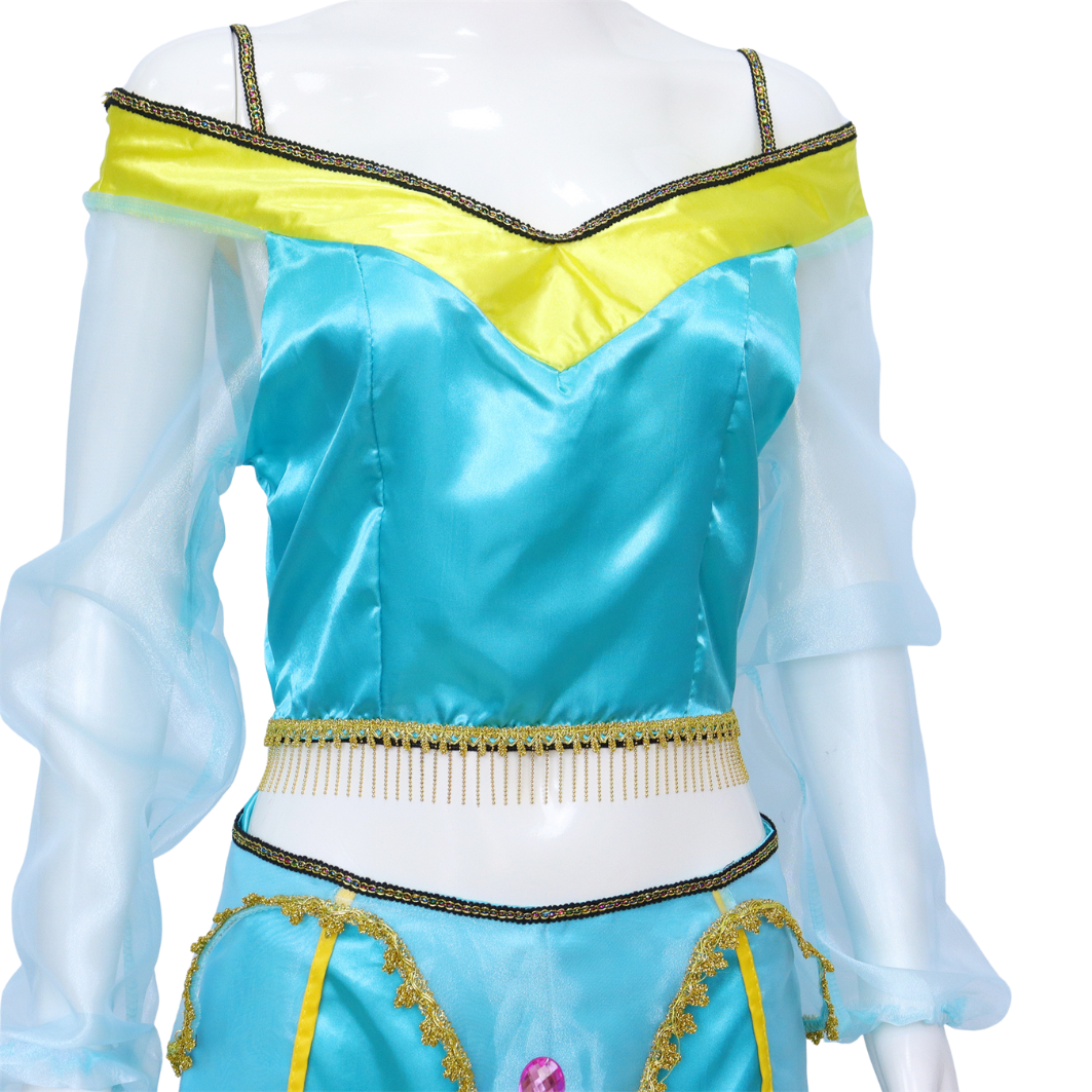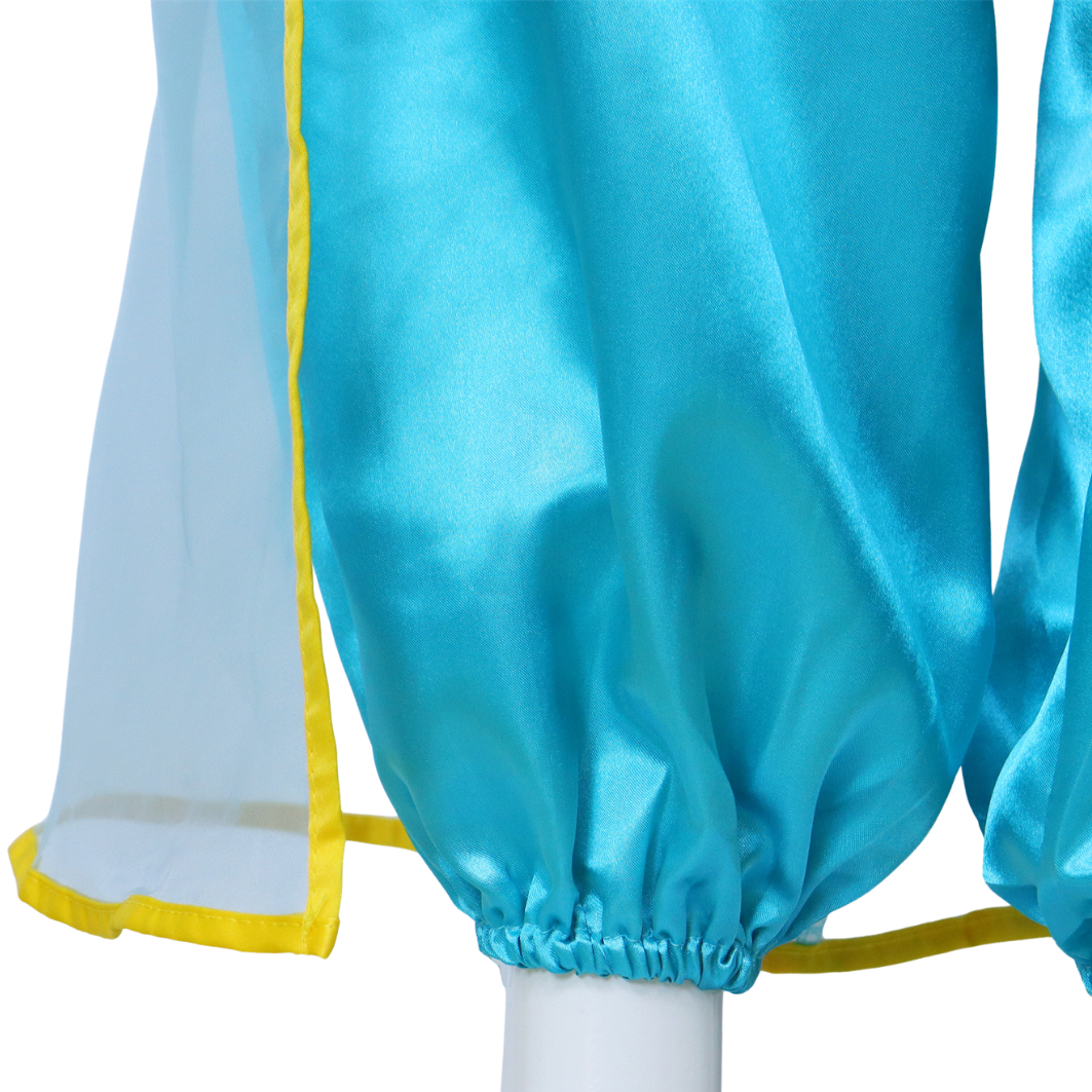 - Prachtige Glanzende Stof: Het pak is gemaakt van een hoogwaardige, glanzende blauwe stof die direct doet denken aan de magie van een oosterse prinses.