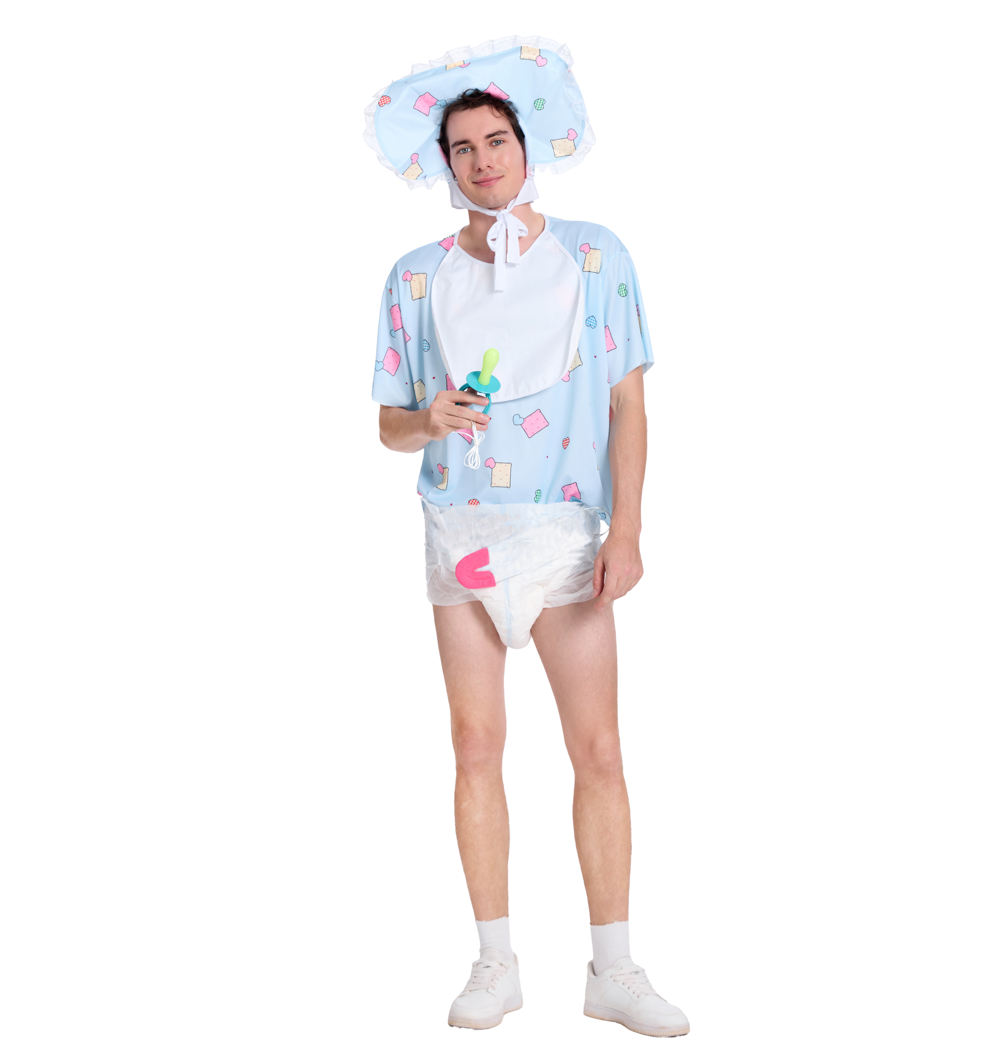 De set bestaat uit een volwassen maat luier met een extra grote veiligheidsspeld voor een grappig effect, een t-shirt met vaste slabber, een bijpassend hoofddeksel en een extra grote speen aan een ketting. Dankzij deze complete samenstelling hoef je niets meer toe te voegen en kun je meteen verkleed de deur uit.