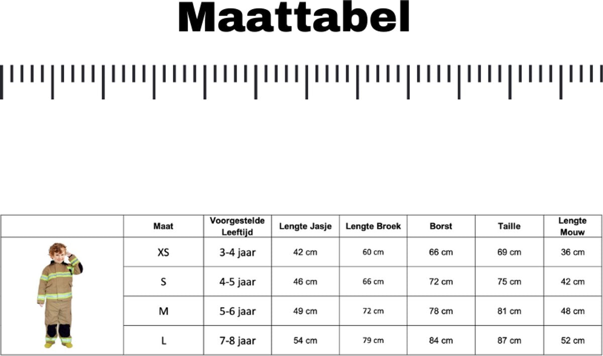 Het brandweerpak is verkrijgbaar in 4 maten: XS, S, M en L. Zie de maattabel tussen de afbeeldingen voor de exacte afmetingen.