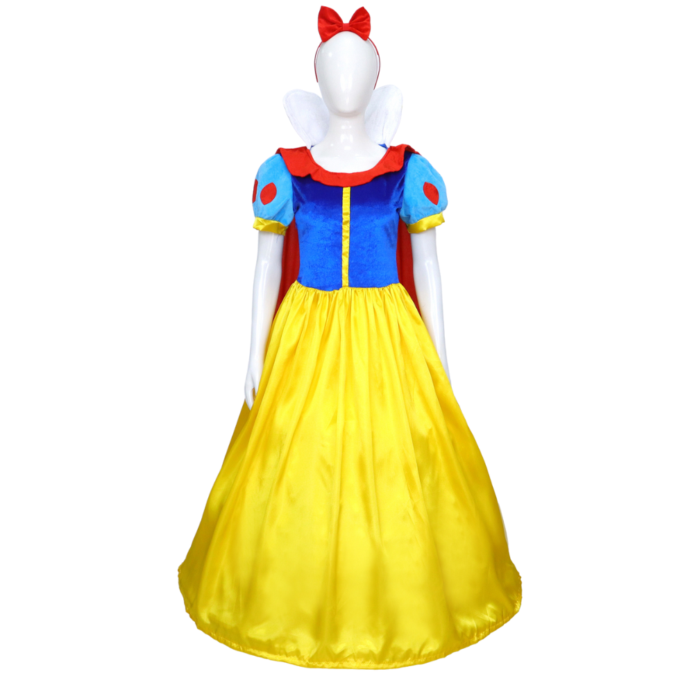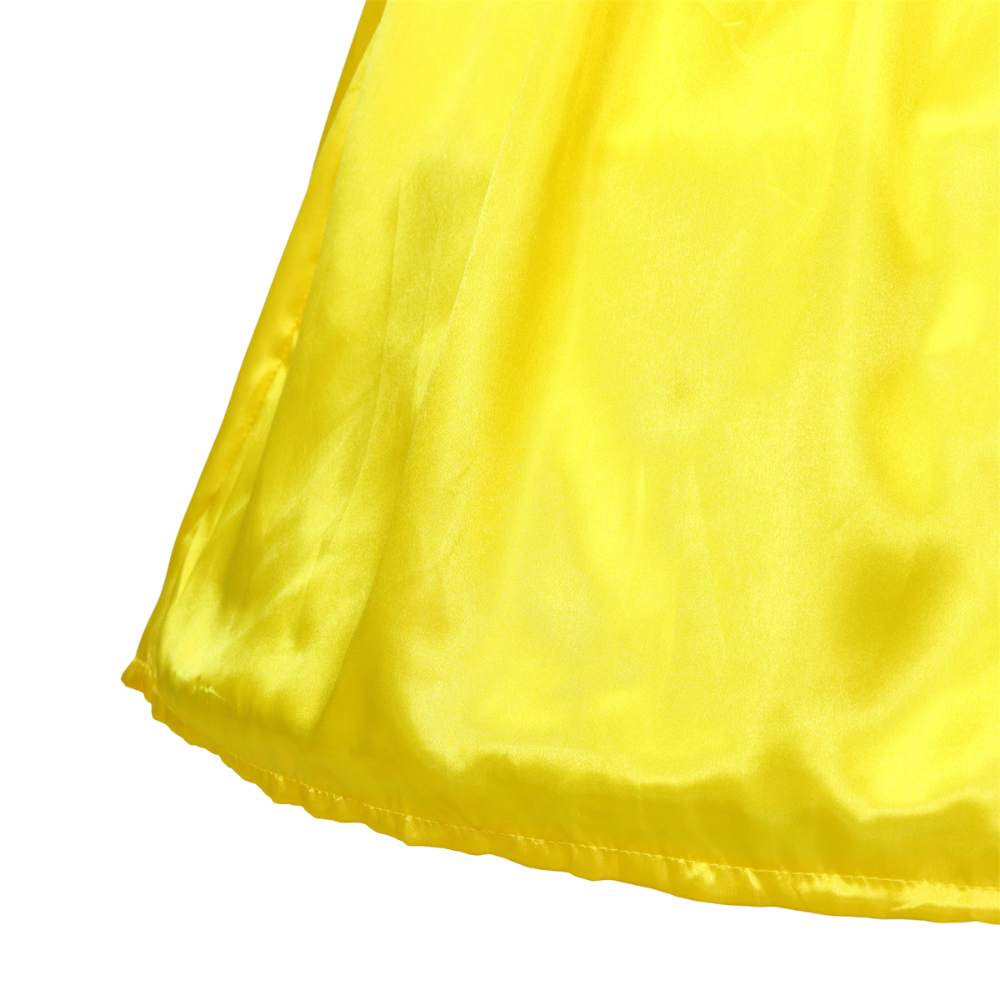 - Iconisch Design: De jurk heeft een donkerblauwe body met schattige pofmouwtjes, afgewerkt met speelse rode details. De zwierige gele rok zorgt voor de klassieke prinsessenlook. (Let op: Voor het volle, opgepofte effect van de rok zoals op de foto’s, is het dragen van een pettycoat nodig – niet inbegrepen).