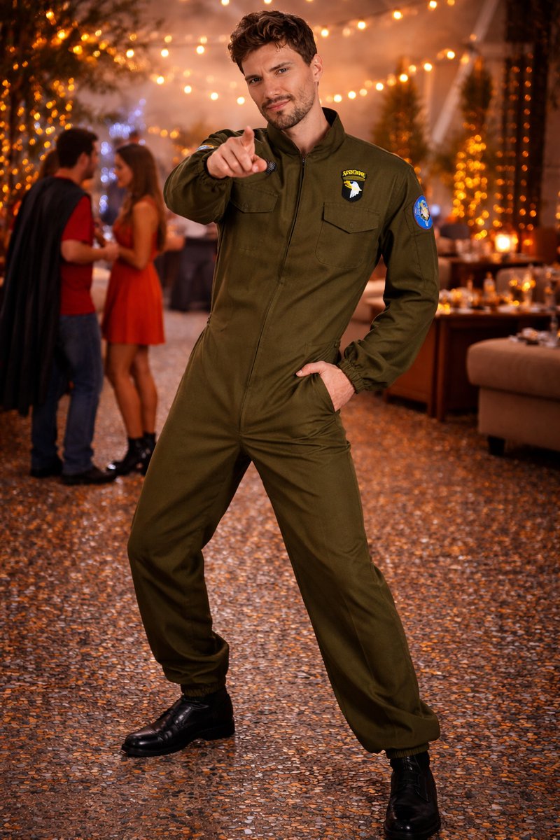 Het pilotenpak is afgewerkt met verschillende stoere patches, waaronder Airforce, Airborne en de Amerikaanse vlag, waardoor de look perfect aansluit bij een echte leger- en straaljagerpiloot.