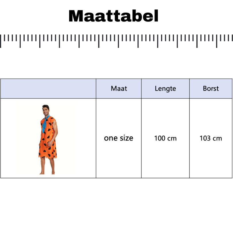 Het oranje kostuum is bedrukt met bruine ‘stenen’-vlekken en wordt geleverd inclusief een opvallende blauwe stropdas – net als Fred uit de iconische animatieserie The Flintstones! De ruwe randen aan de onderkant geven het geheel een echte steentijd-look. Combineer het met een knuppel (niet inbegrepen) en je bent klaar om Yabba Dabba Doo te roepen!