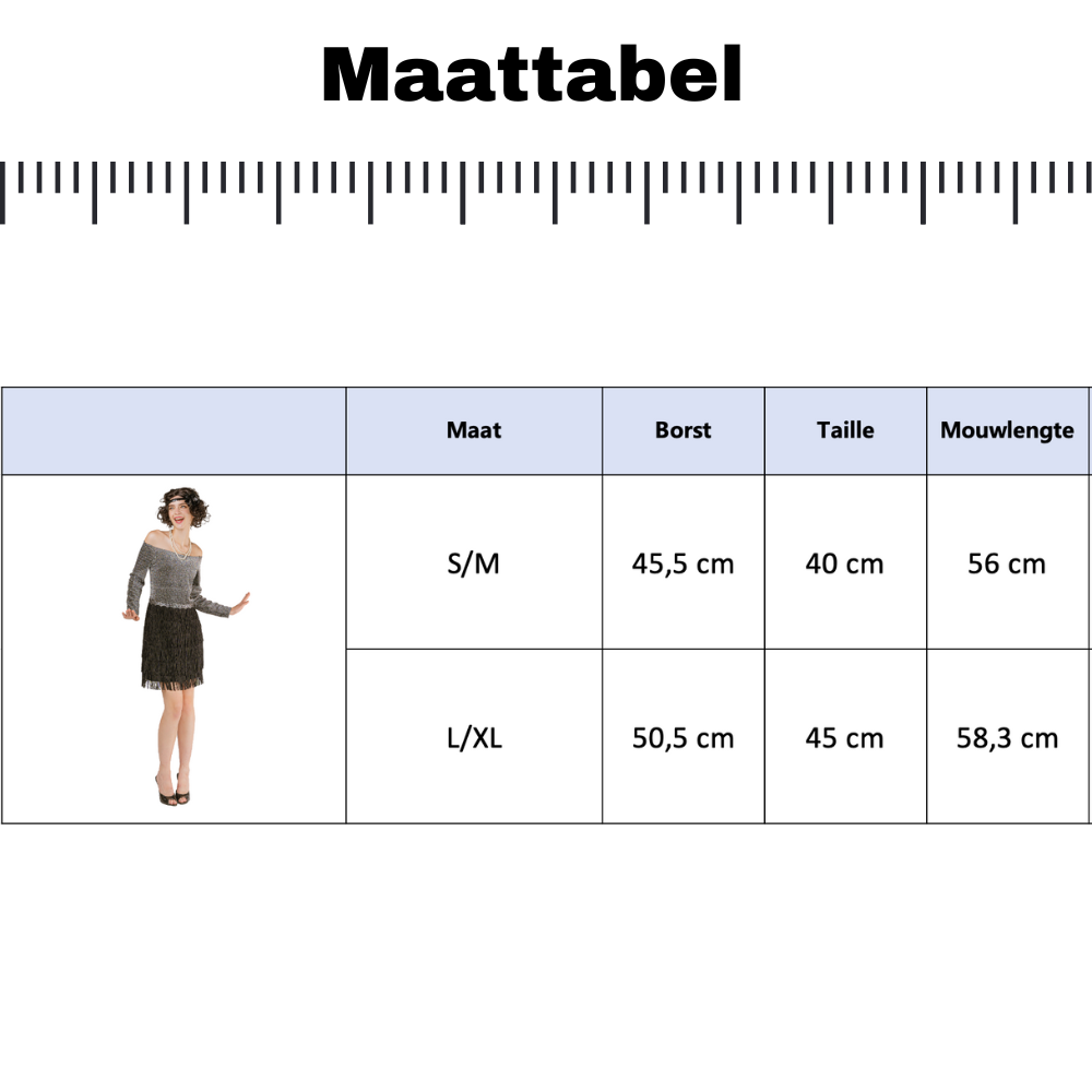 De set wordt compleet geleverd met een zwarte haarband met pailletten en een elegante bloem, een onmisbaar accessoire voor de authentieke Gatsby-uitstraling.
