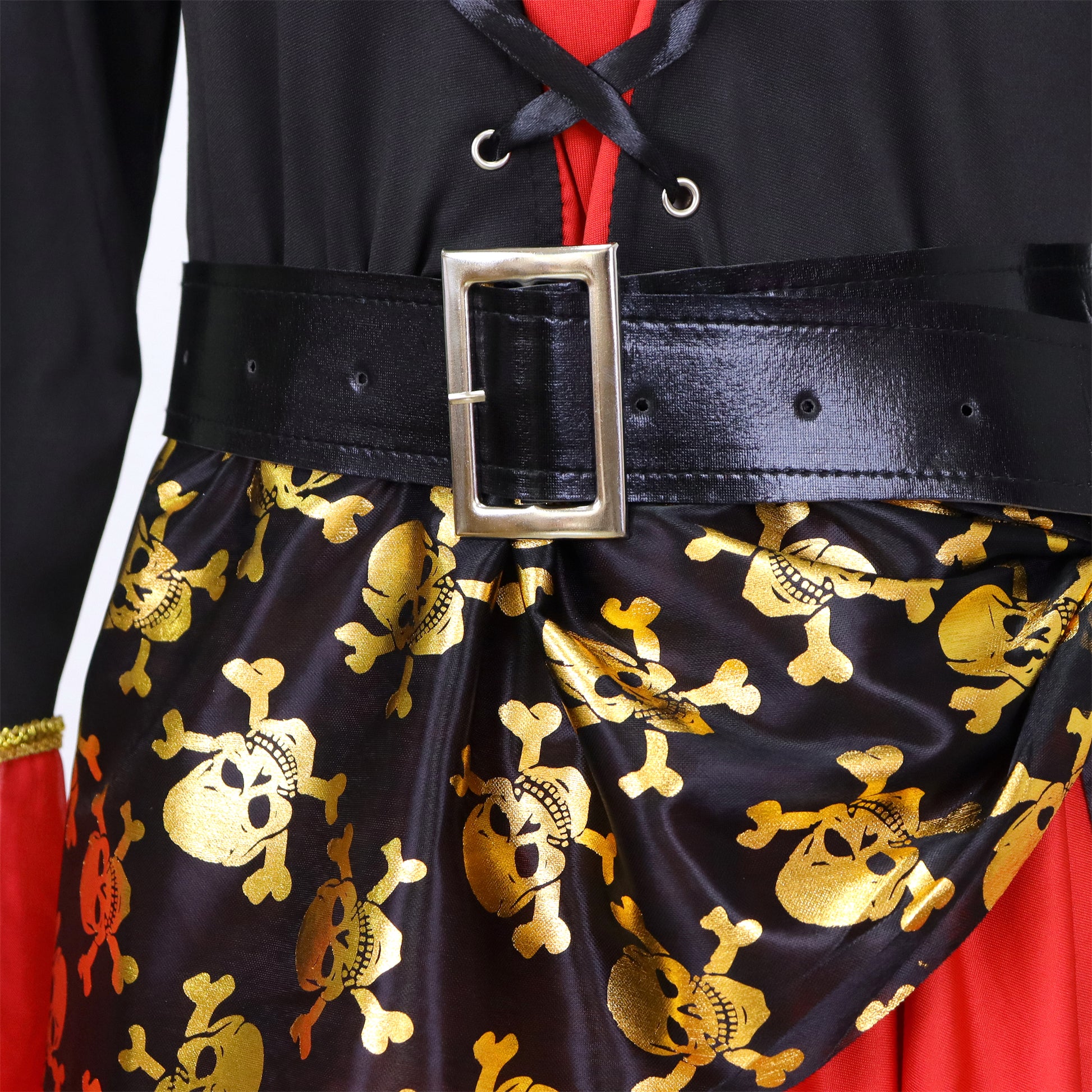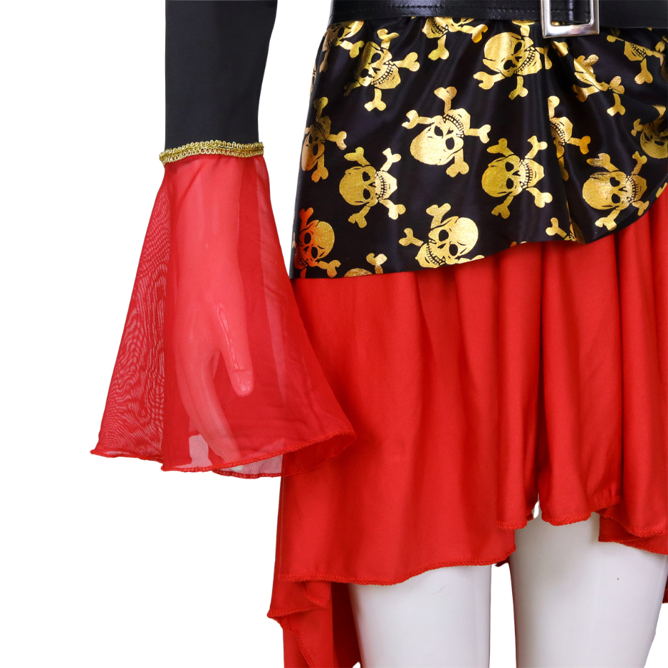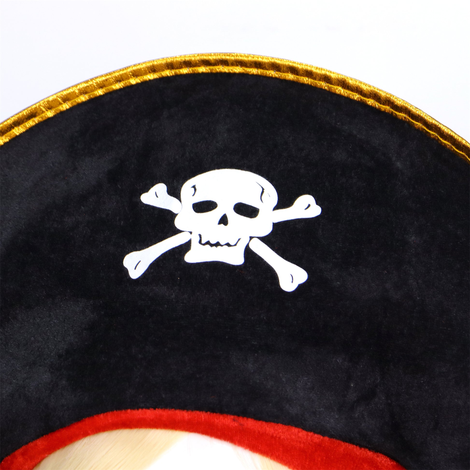 De set wordt compleet gemaakt met een klassieke piratenhoed, voorzien van een rood fluwelen band bij het hoofd voor extra flair en authenticiteit.