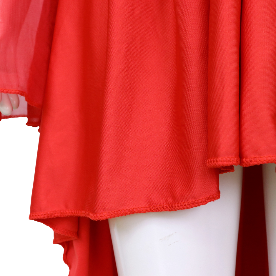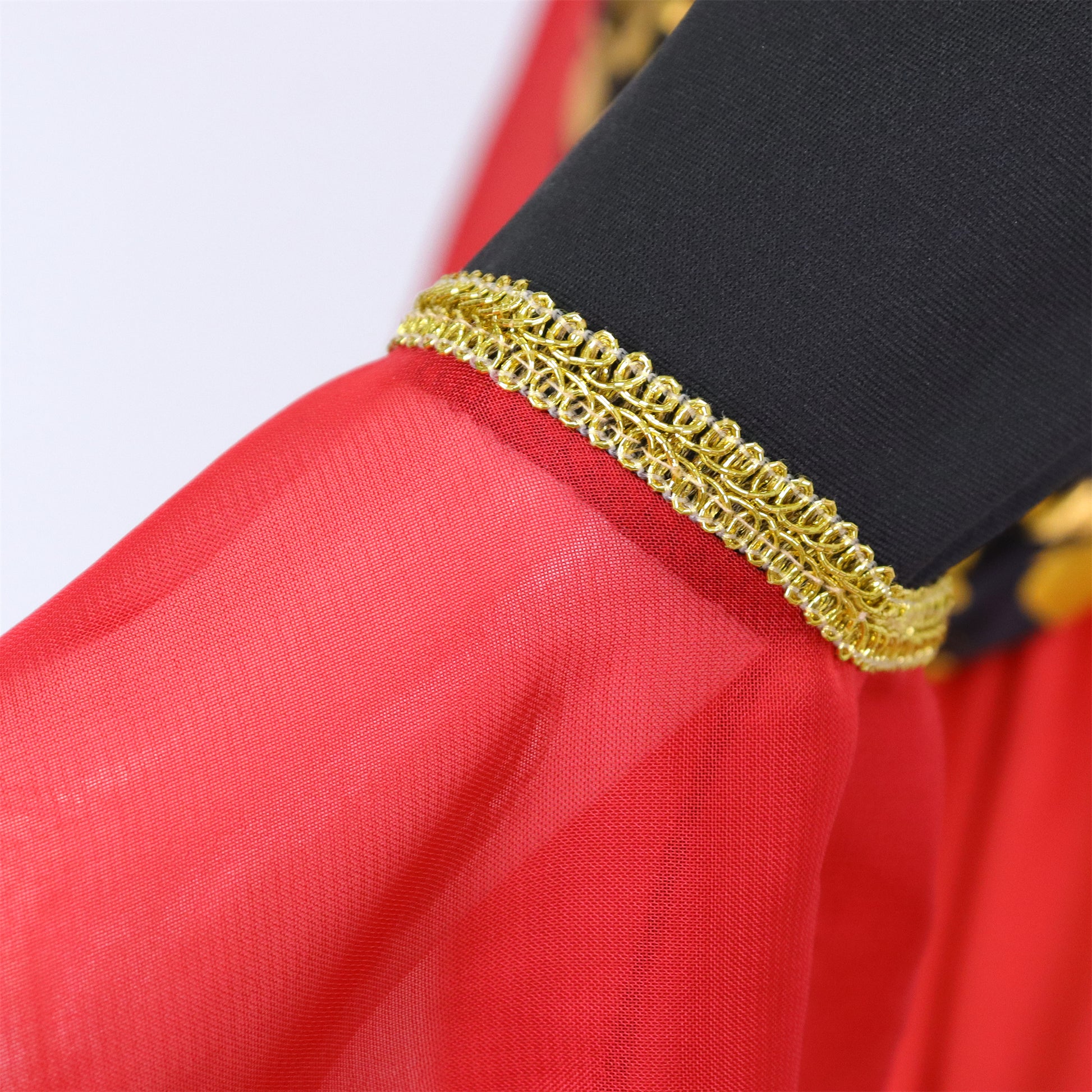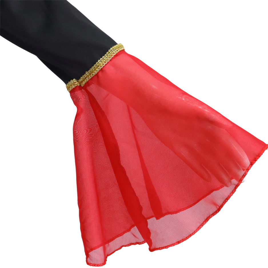 - Wijd uitlopende rode mouwen aan het uiteinde voor een dramatisch en stijlvol effect