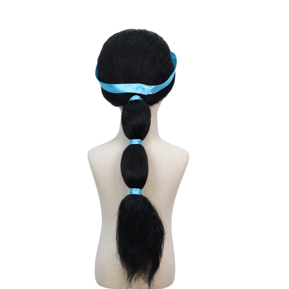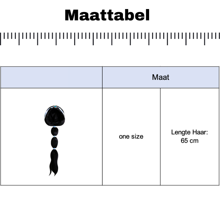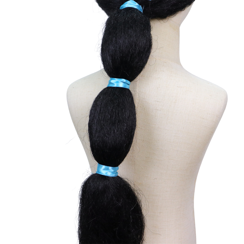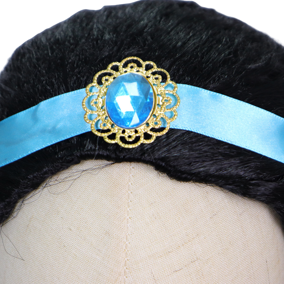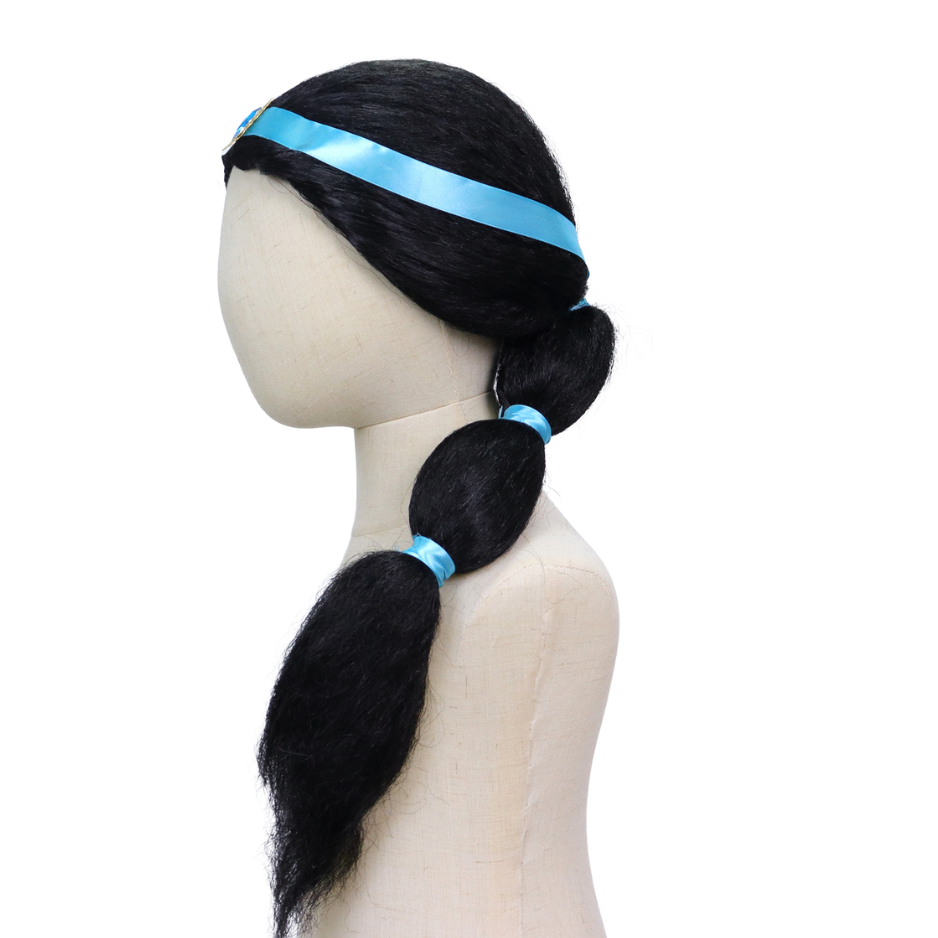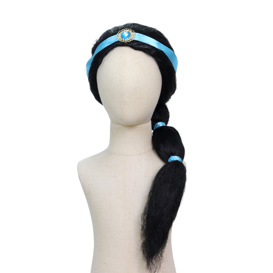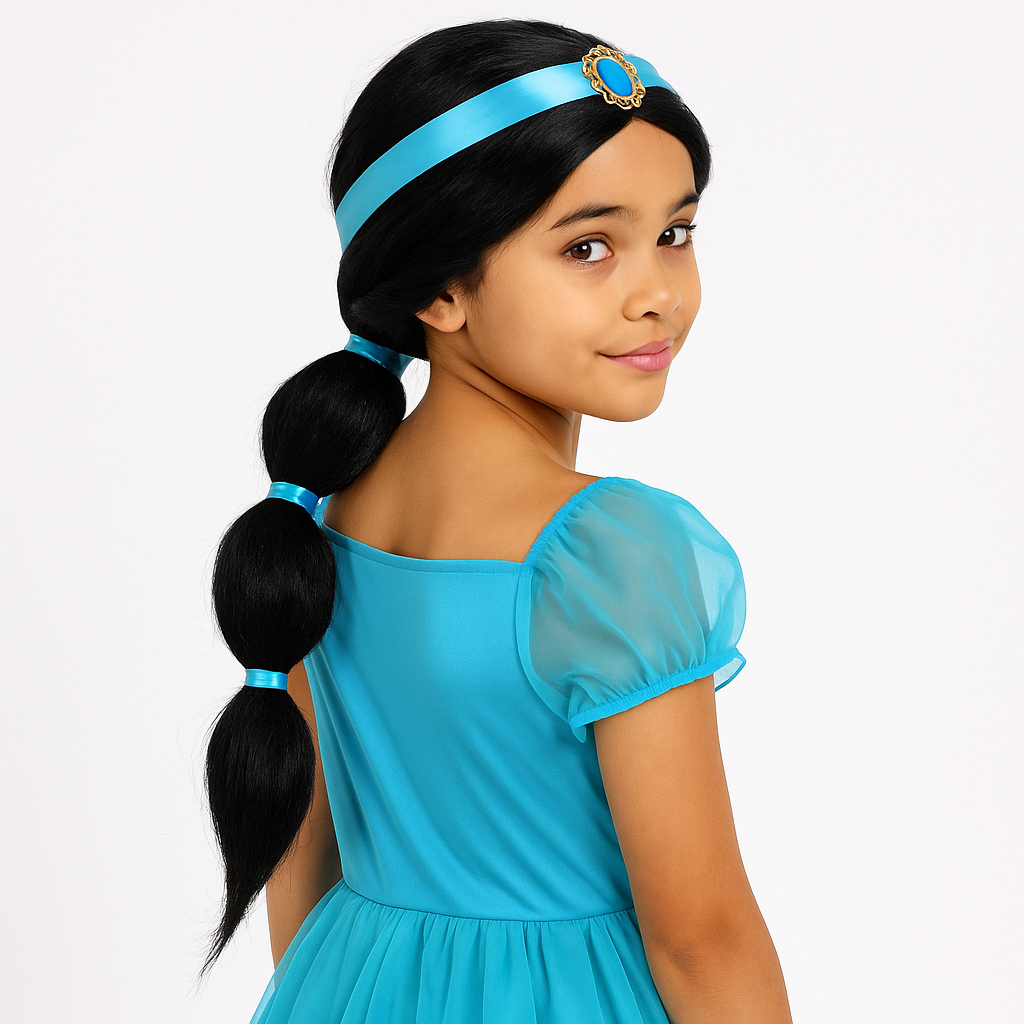 Laat de droom van jouw kleine prinses uitkomen met deze prachtige Jasmine-stijl kinderpruik! Met een indrukwekkende lengte van 65 cm en voorzien van de kenmerkende blauwe linten en siersteen, is deze pruik het ultieme accessoire voor elke sprookjesachtige verkleedpartij. Of het nu voor carnaval, een themafeest of gewoon voor magisch speelplezier is – jouw kind zal zich in een oogwenk een echte Oosterse prinses voelen!