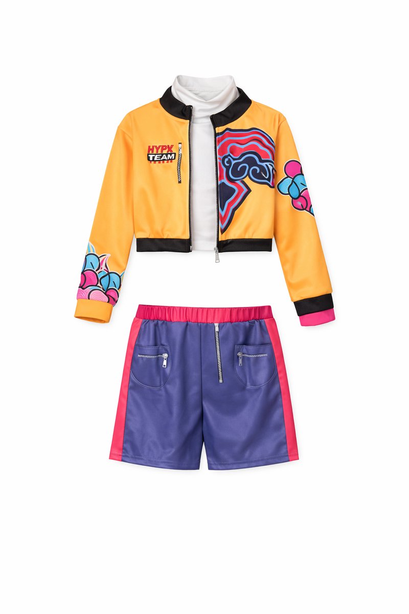 - Een felgeel jasje met zwarte accenten, kleurrijke prints op de mouwen en borst – een echte eyecatcher geïnspireerd op het kostuum uit de bekende animatiefilm
