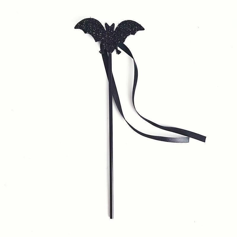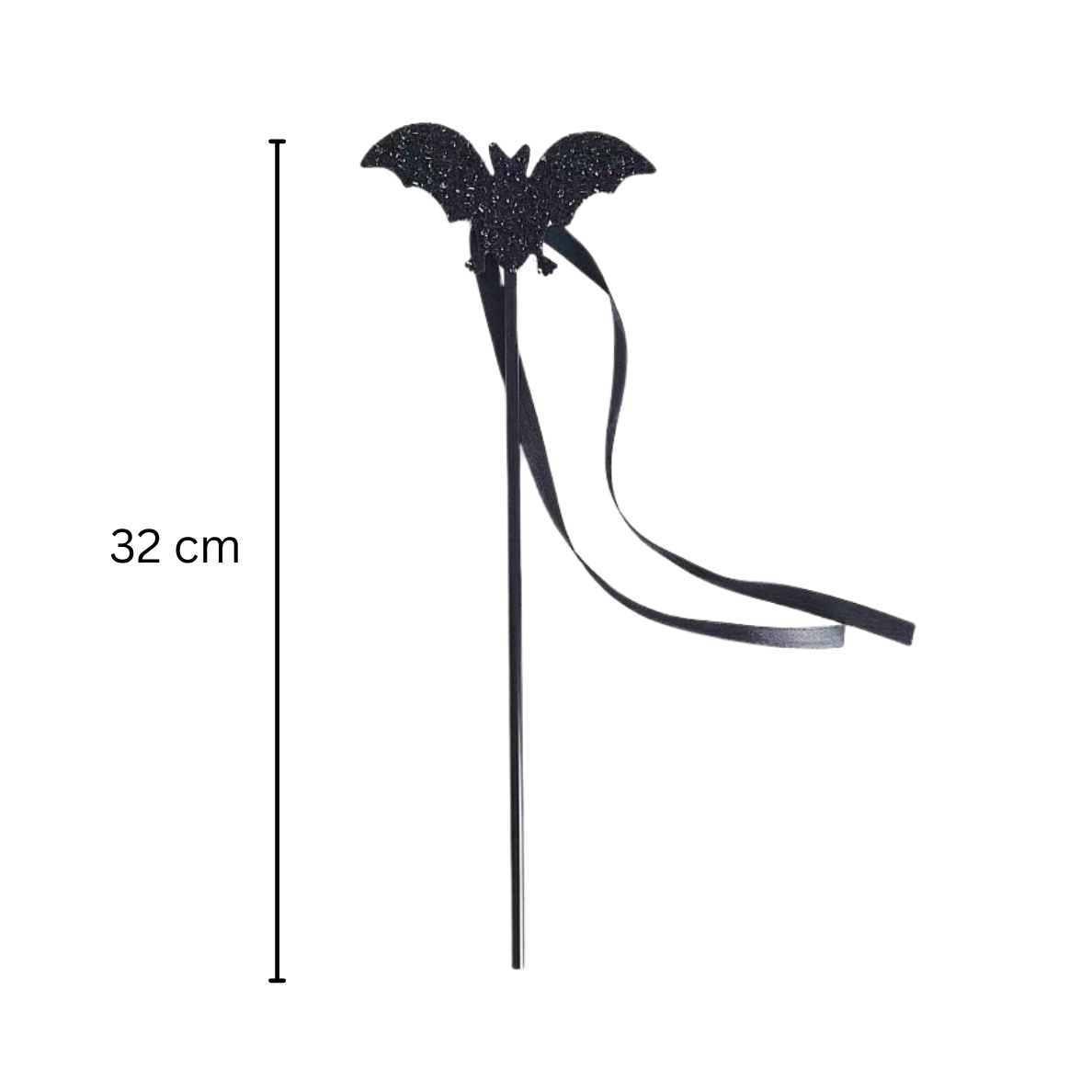 Bijpassende glittervleermuis op een zwart stokje met sierlinten – ideaal om mee te toveren of rond te zwaaien!