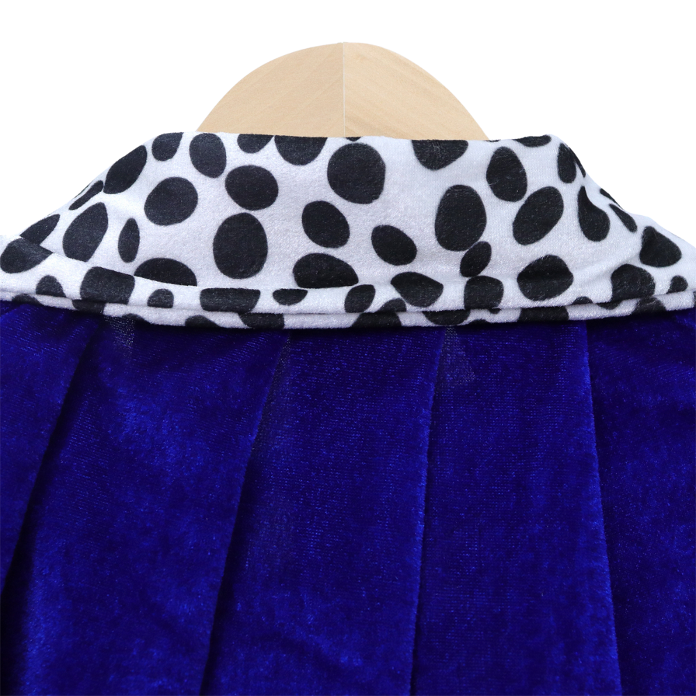 De prachtige blauwe cape is gemaakt van heerlijk zacht fluweel dat niet alleen comfortabel aanvoelt, maar ook een luxe uitstraling geeft. De rand en kraag van de cape zijn afgewerkt met een koninklijk patroon van wit met zwarte stippen, wat zorgt voor een klassieke, vorstelijke look. Deze set is compleet met een gouden kroon en een bijpassende staf, zodat je van top tot teen een echte koning bent. De kroon is gemaakt van zacht materiaal voor optimaal draagcomfort, en de staf voegt een extra vleugje grandeur toe aan je outfit.