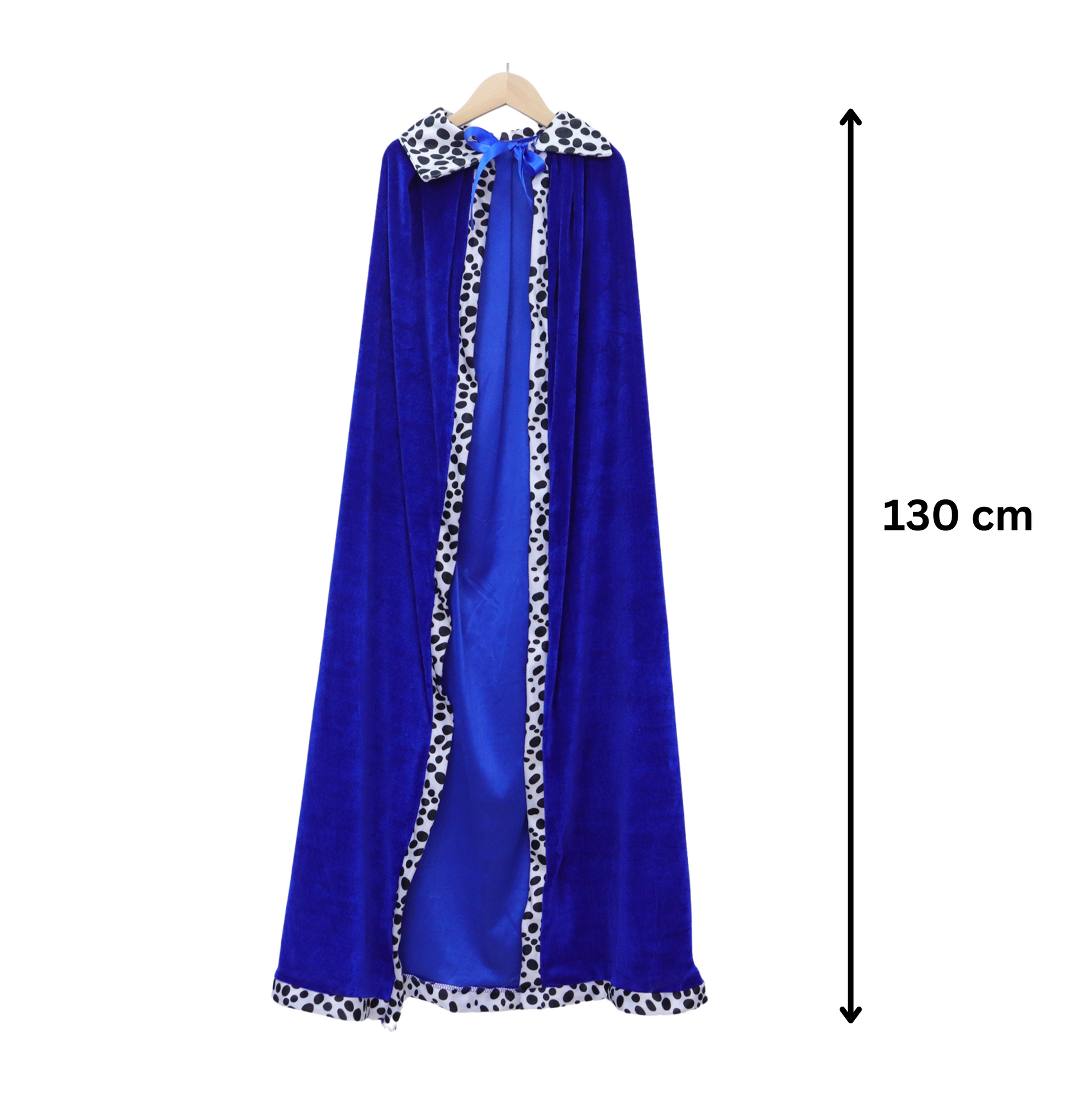 - Blauwe fluwelen cape: Een statige cape van 130 cm lang, afgezet met een wit-zwarte rand en een koninklijke kraag.