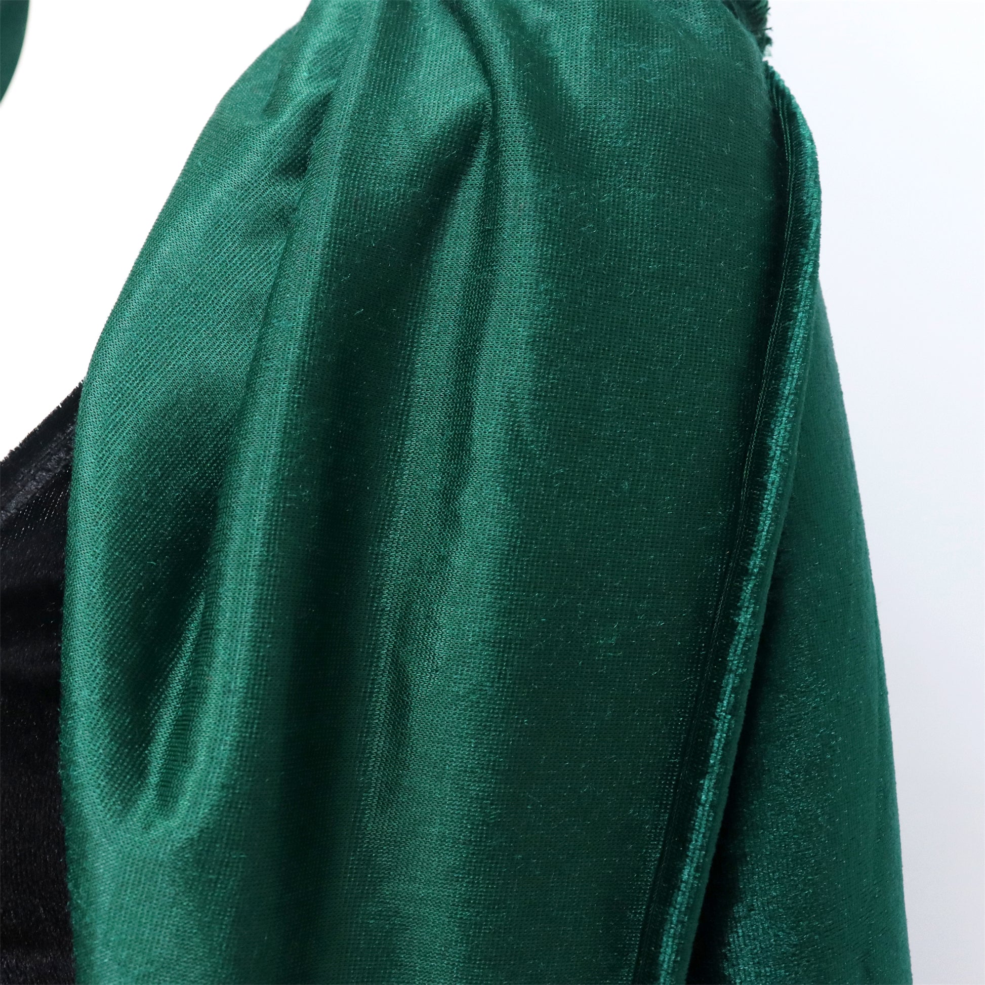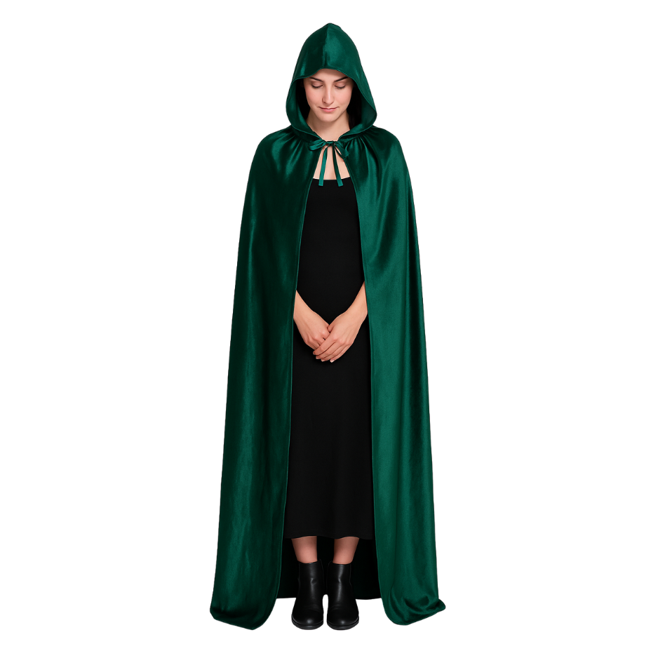 Met zijn klassiek donker groene kleur en elegante snit is deze cape perfect te combineren met allerlei kostuums – van vampier tot tovenaar, heks of middeleeuwse krijger. De grote capuchon zorgt voor een dramatisch effect en maakt het geheel mysterieus en indrukwekkend.