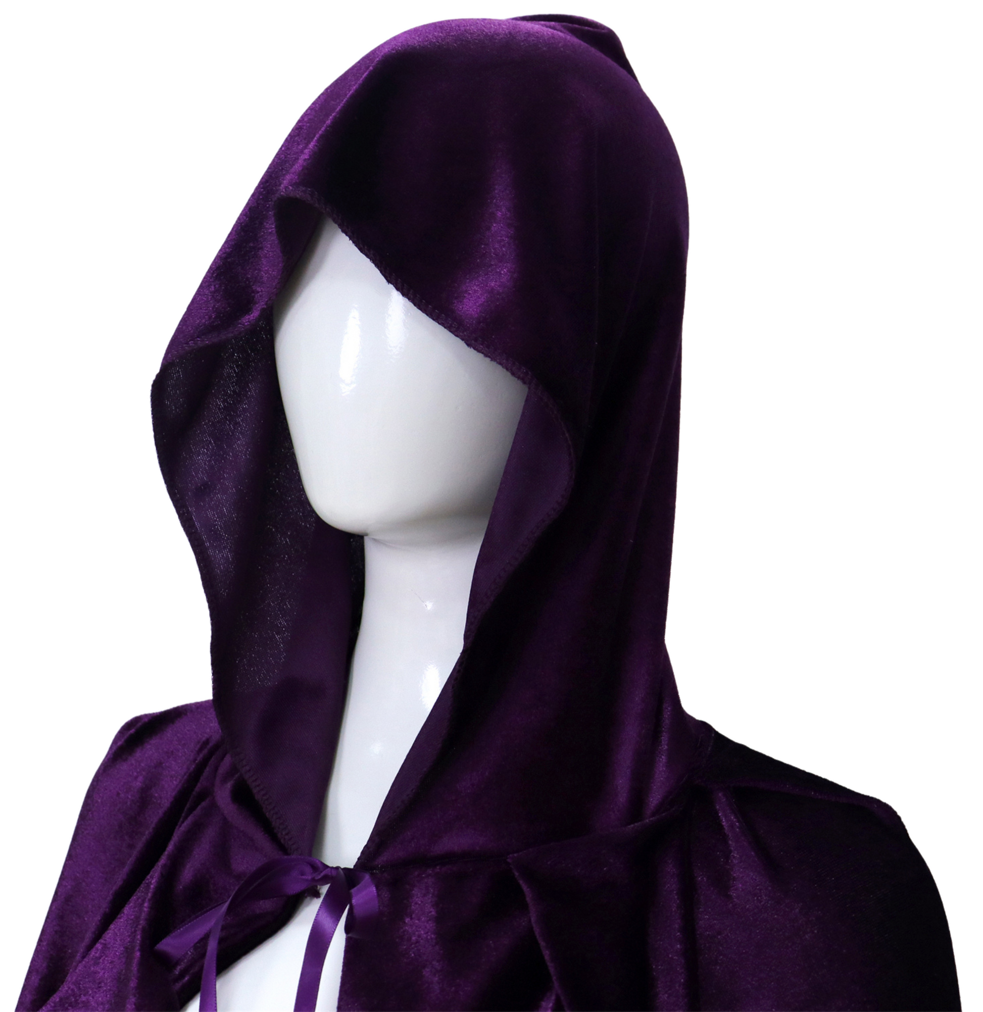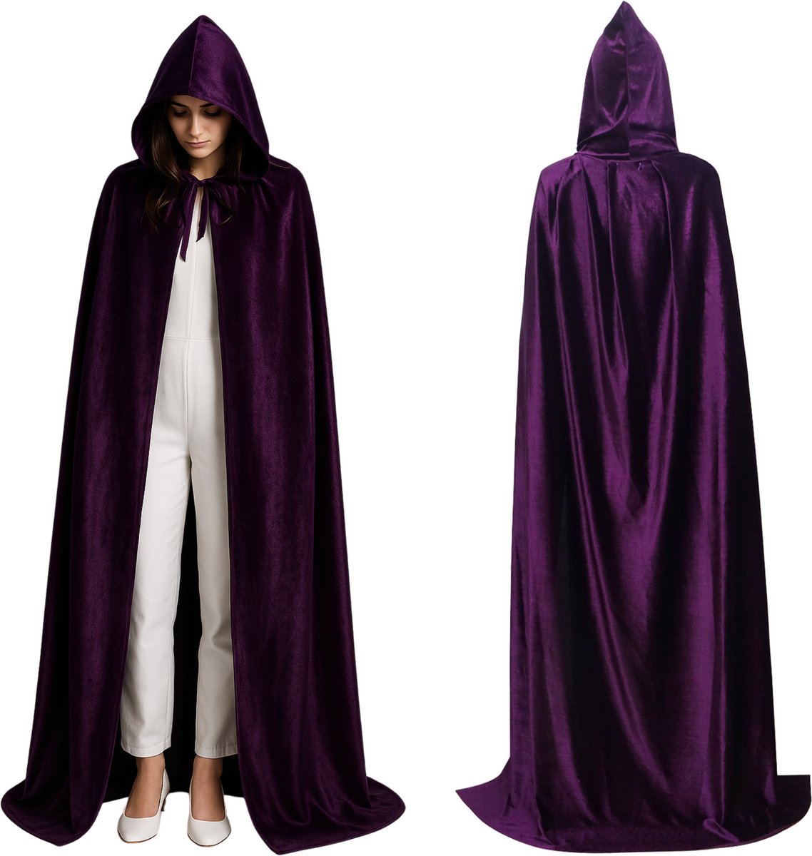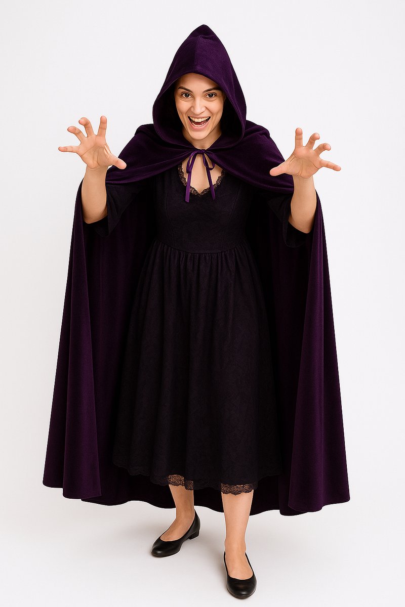 Met zijn klassiek donker paarse kleur en elegante snit is deze cape perfect te combineren met allerlei kostuums – van vampier tot tovenaar, heks of middeleeuwse krijger. De grote capuchon zorgt voor een dramatisch effect en maakt het geheel mysterieus en indrukwekkend.