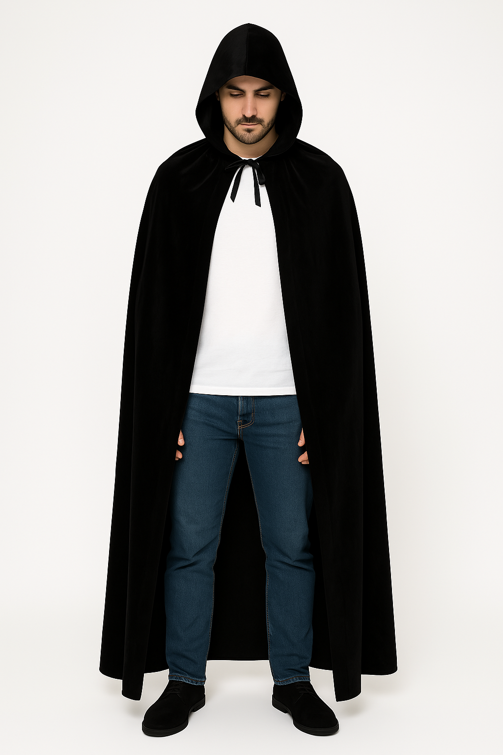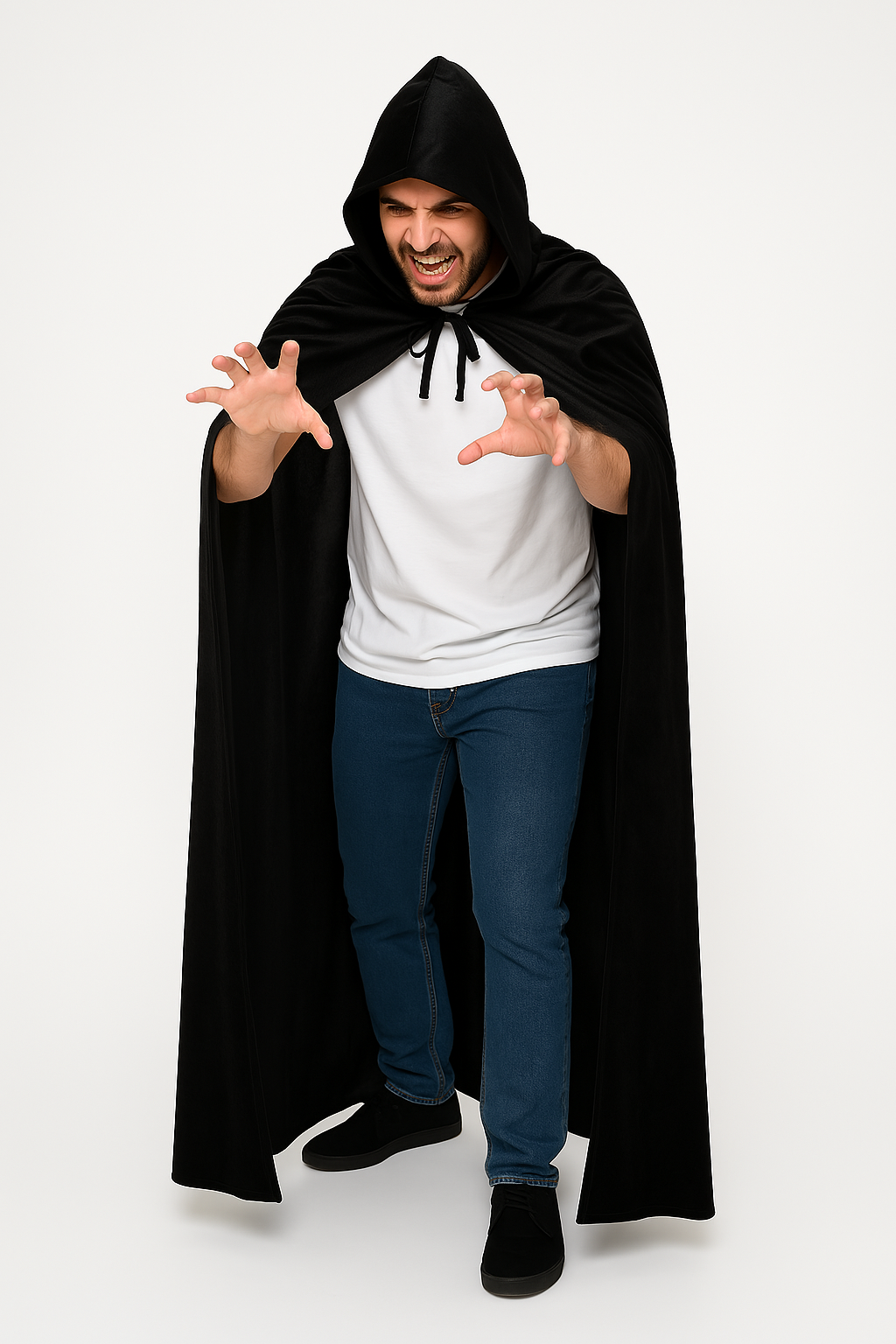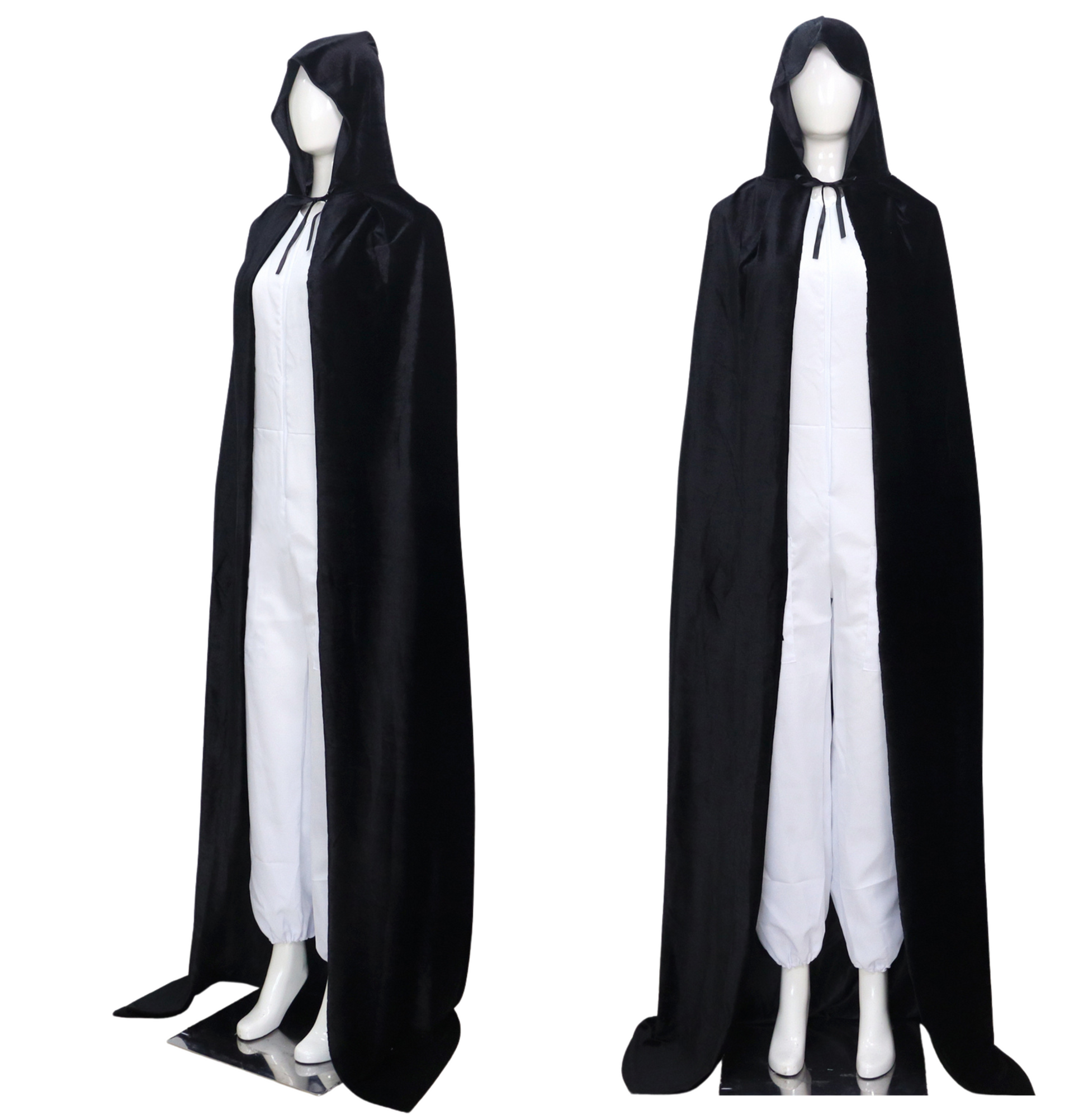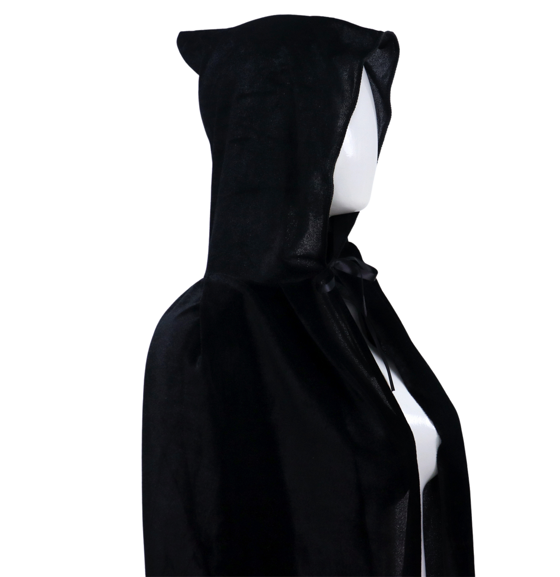 Met zijn klassiek zwarte kleur en elegante snit is deze cape perfect te combineren met allerlei kostuums – van vampier tot tovenaar, heks of middeleeuwse krijger. De grote capuchon zorgt voor een dramatisch effect en maakt het geheel mysterieus en indrukwekkend.