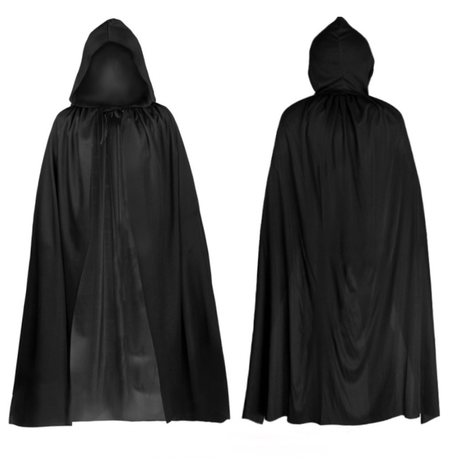 - Een lange zwarte cape met capuchon (170 cm)
