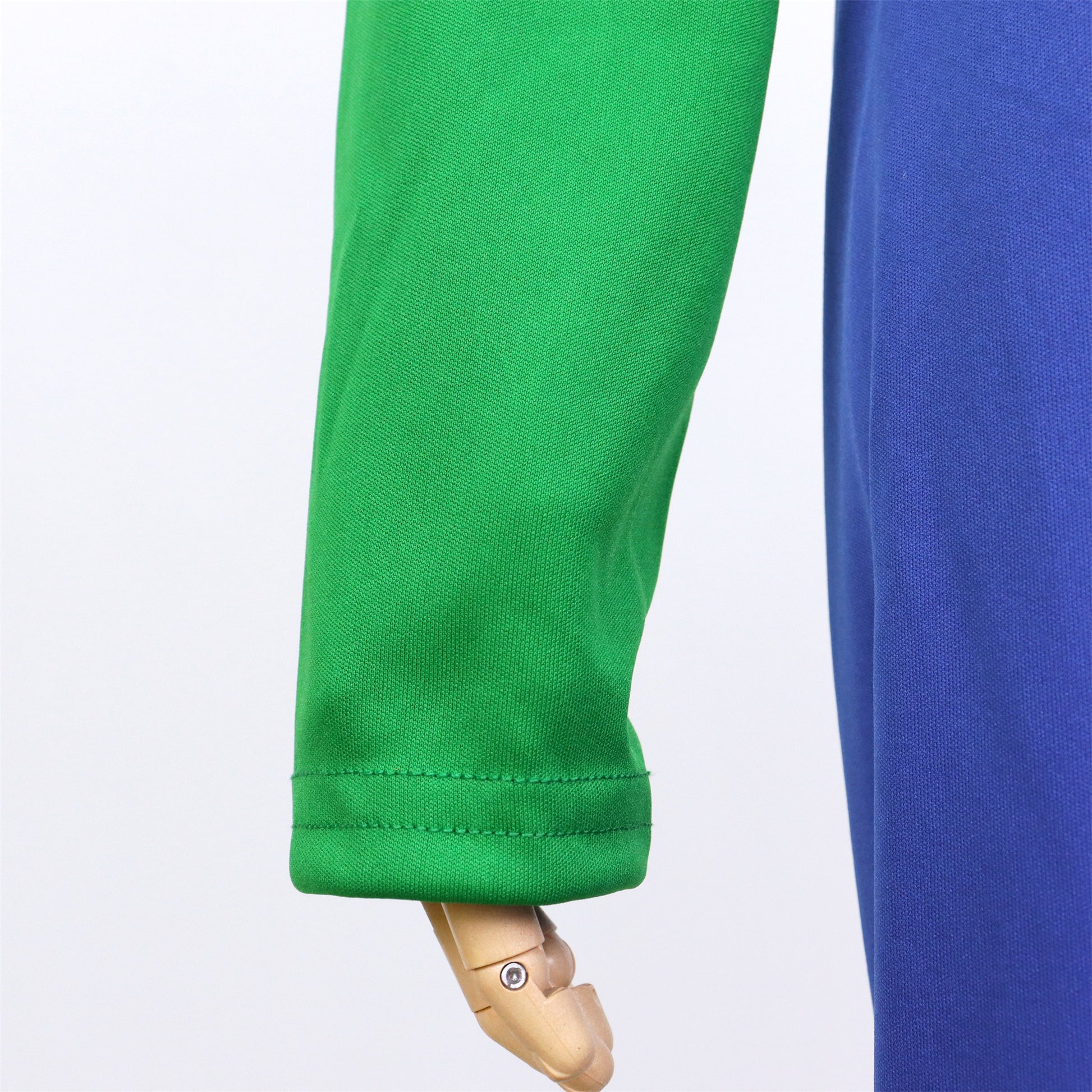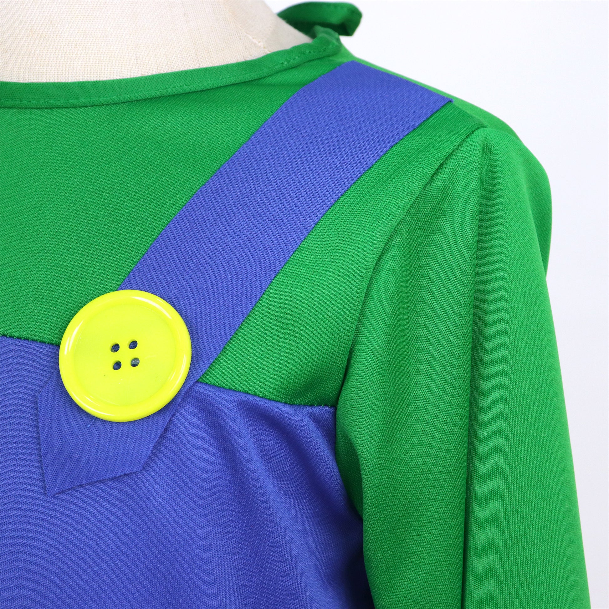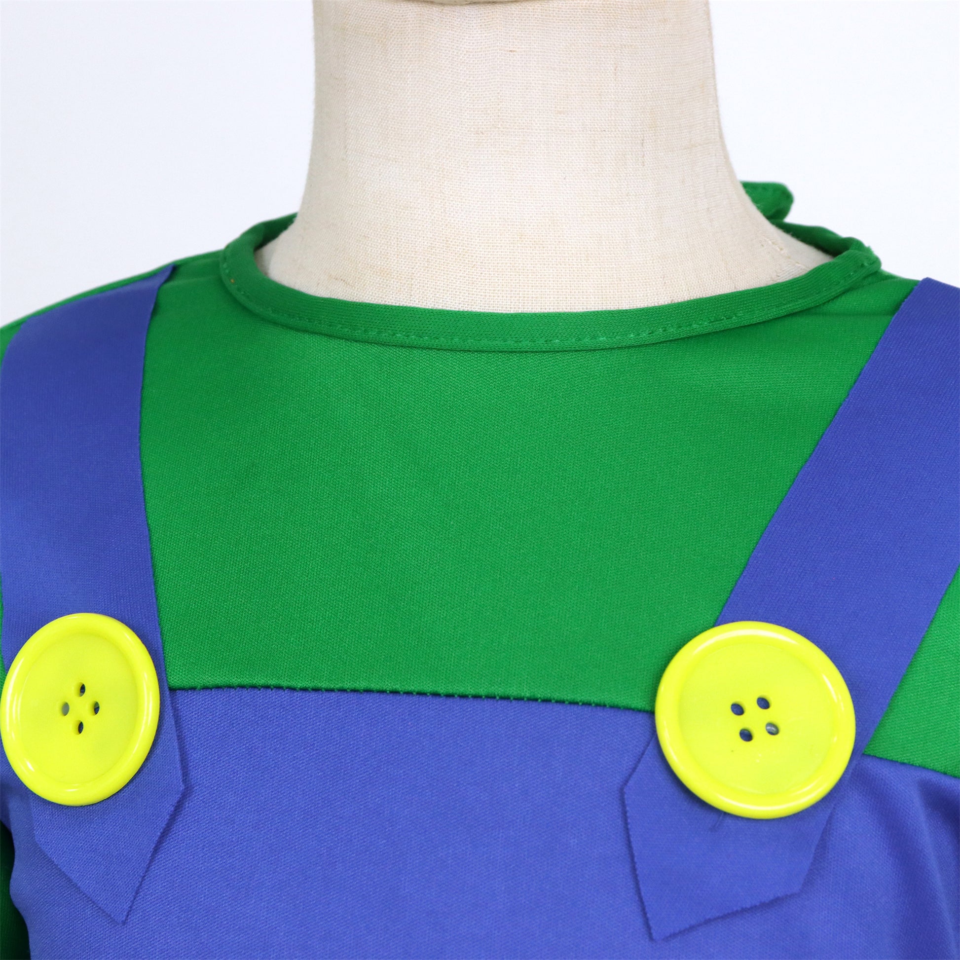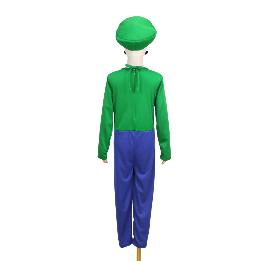 De outfit bestaat uit een comfortabele, rekbare jumpsuit die eruitziet alsof je kind een groene longsleeve draagt met daarover een klassieke blauwe tuinbroek – precies zoals Luigi eruitziet in de bekende spellen. Dankzij het stretchmateriaal biedt het volop bewegingsvrijheid, perfect om in te spelen en te rennen.