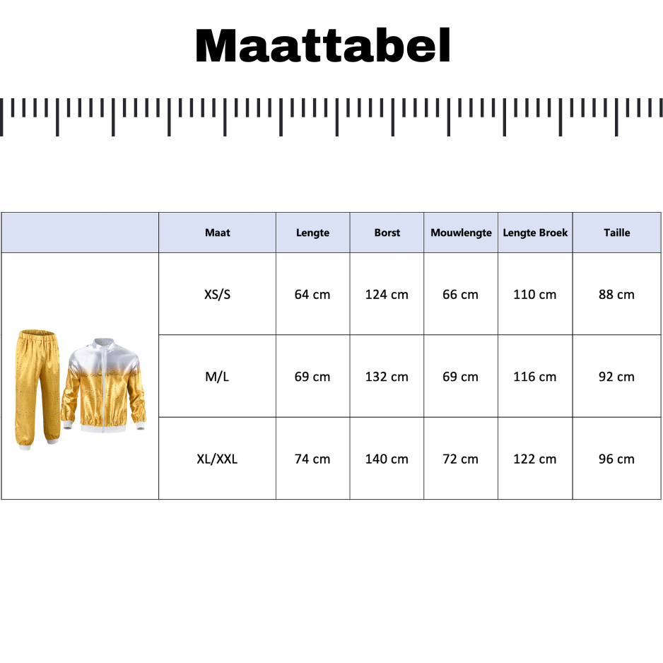 De glanzende stof en het speelse ontwerp geven dit pak een echte jaren 80 / 90 uitstraling, waardoor je direct opvalt tussen de massa.