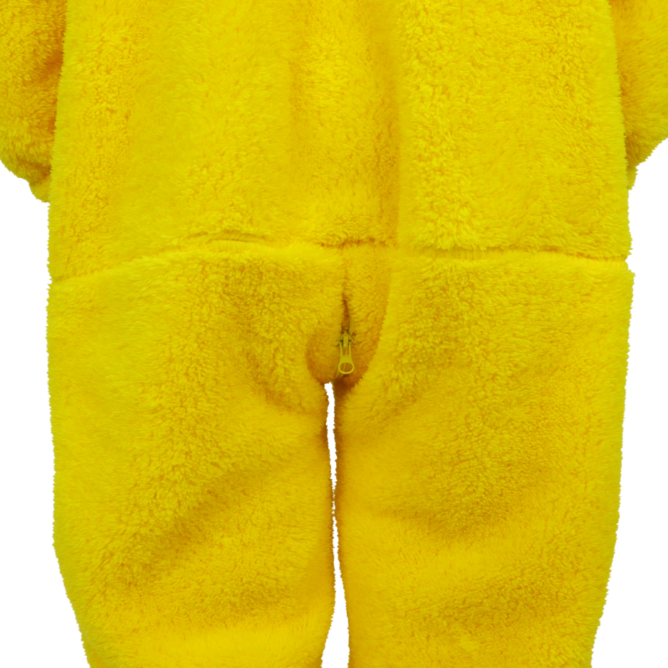 Wat dit pak extra bijzonder maakt, is de lange ritssluiting die helemaal van boven tot onderaan doorloopt. Superhandig voor het snel aan- en uittrekken én ideaal bij toiletbezoekjes. Geen gedoe, alleen maar speelplezier! De capuchon heeft een vrolijke vorm met figuuroortjes, precies zoals bij de iconische tv-figuren – zonder ze te noemen. Het buikvlak is afgewerkt met zachte, contrasterende pluche vlakken, helemaal in stijl.