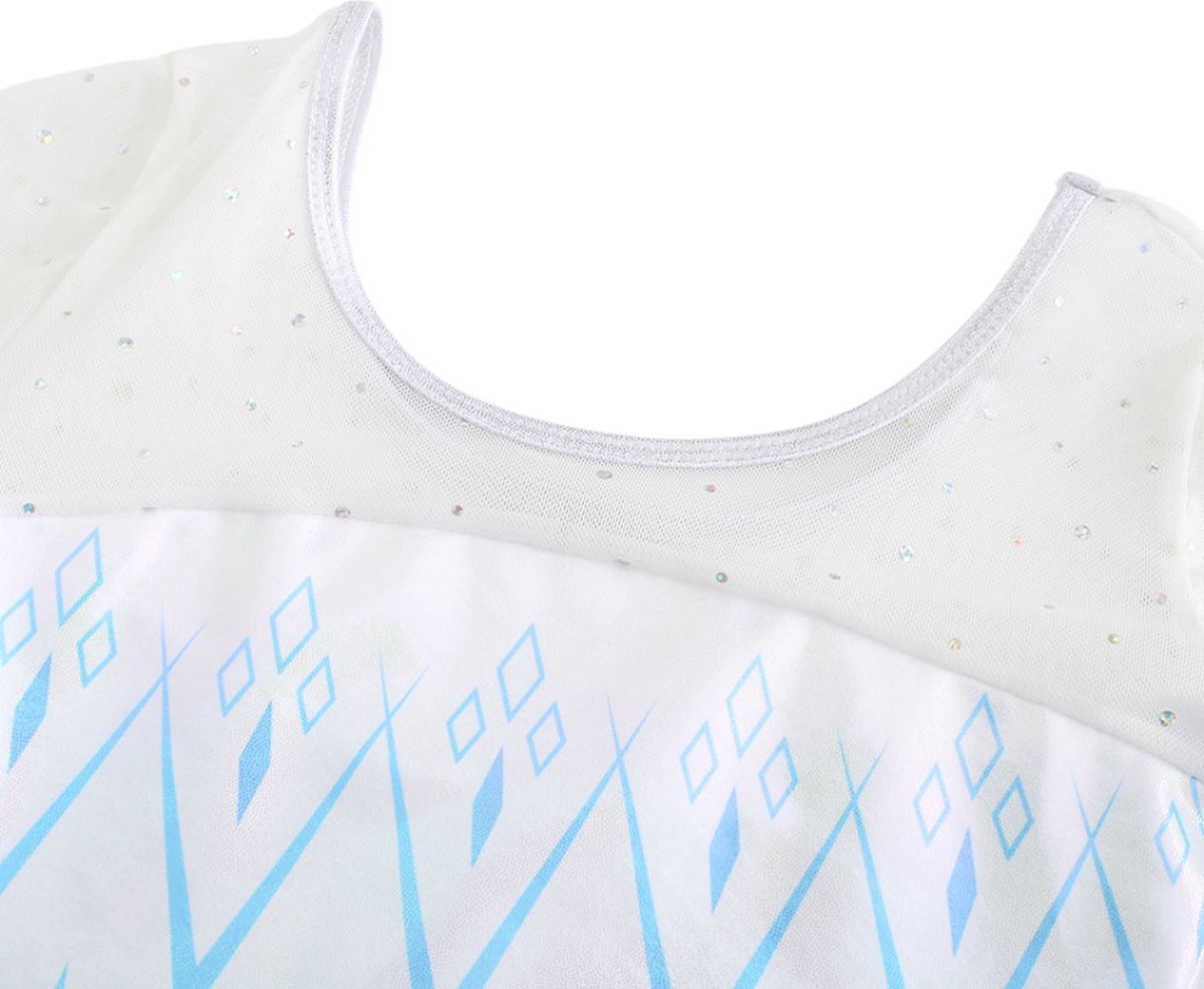 - Body met Lange Mouwen: Het turnpakje heeft een schitterend ontwerp met een doorzichtig witte bovenkant en mouwen, afgezet met fonkelende glitterstenen. Het wit loopt prachtig over in een metallic blauw lijfje voor een magisch effect.