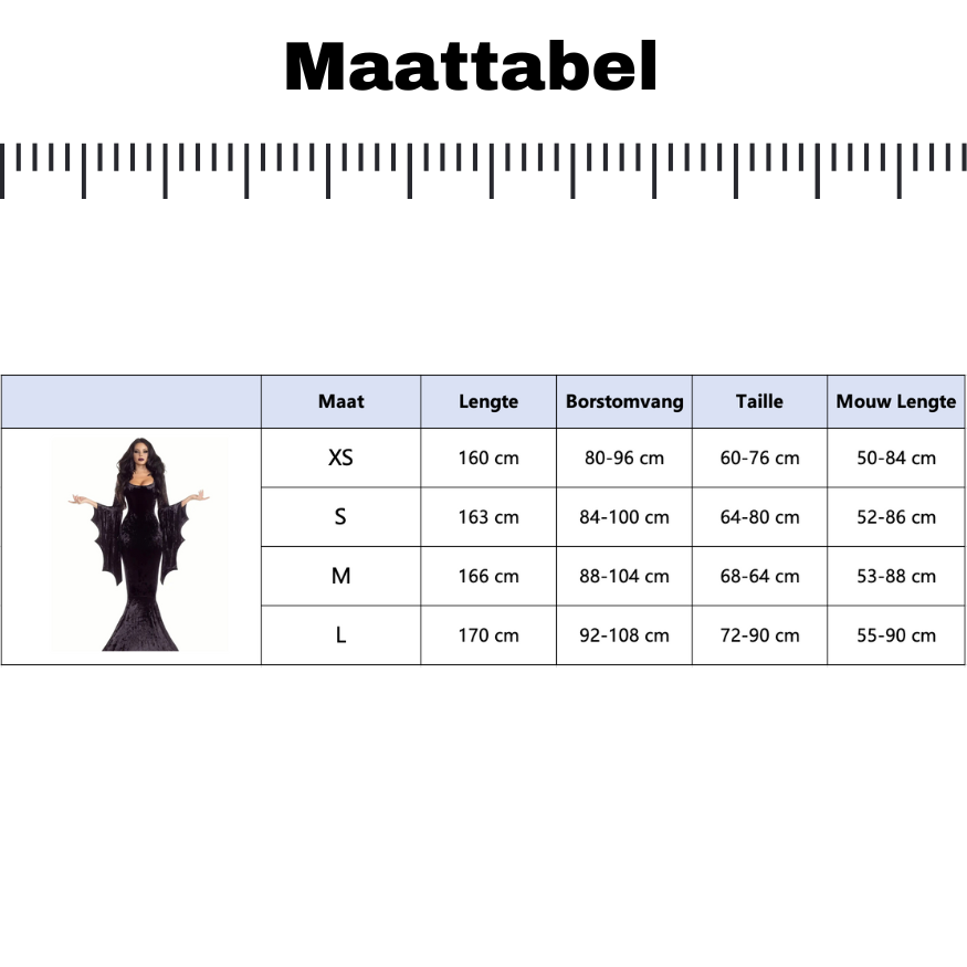 - Elegant vampierdesign – Lange mouwen met vleermuisvorm en een uitlopende onderkant in bijpassend patroon