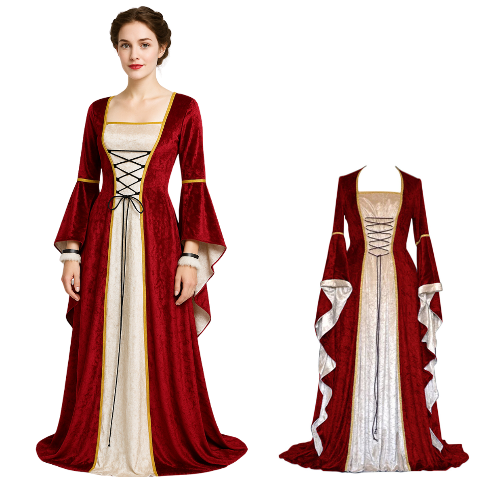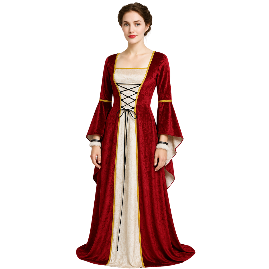 - Iconisch middeleeuws ontwerp: Dieprood met champagnekleurige accenten en goudkleurige biezen – een klassieke combinatie voor een koninklijke look.