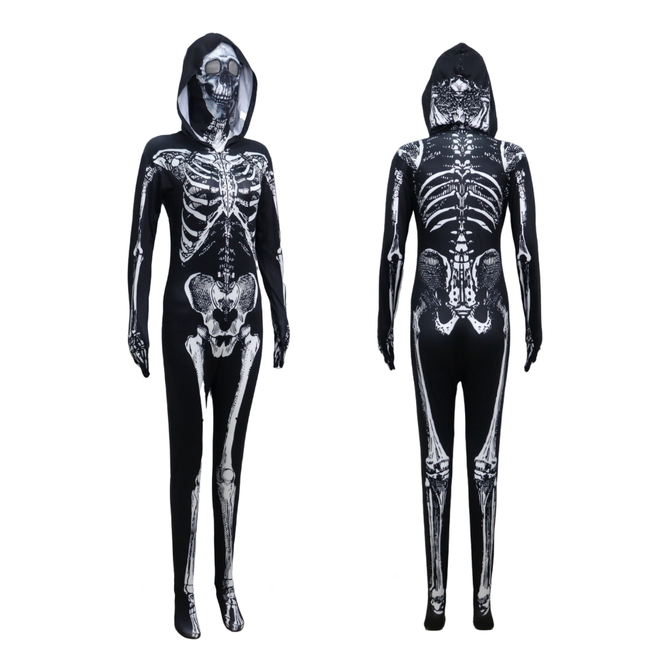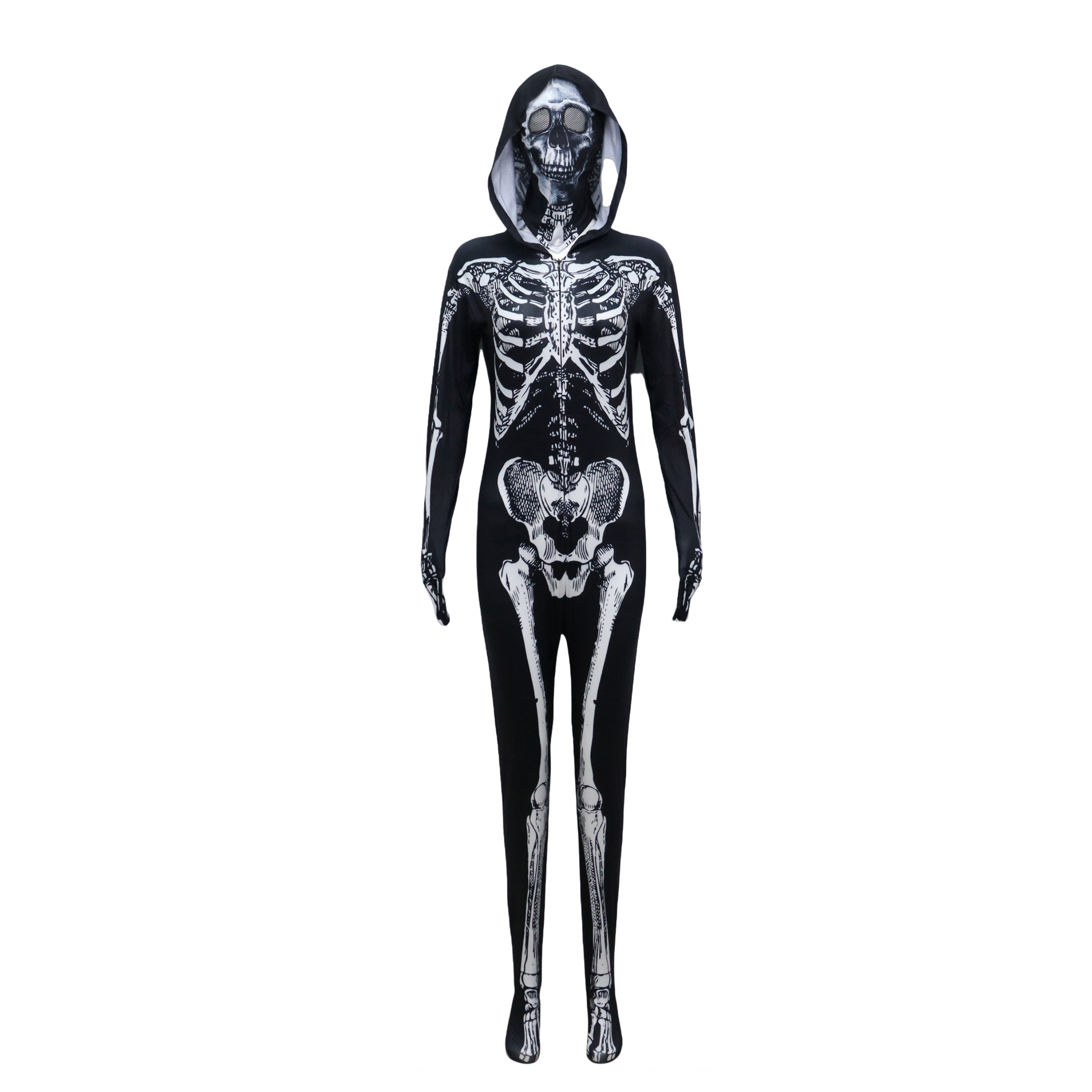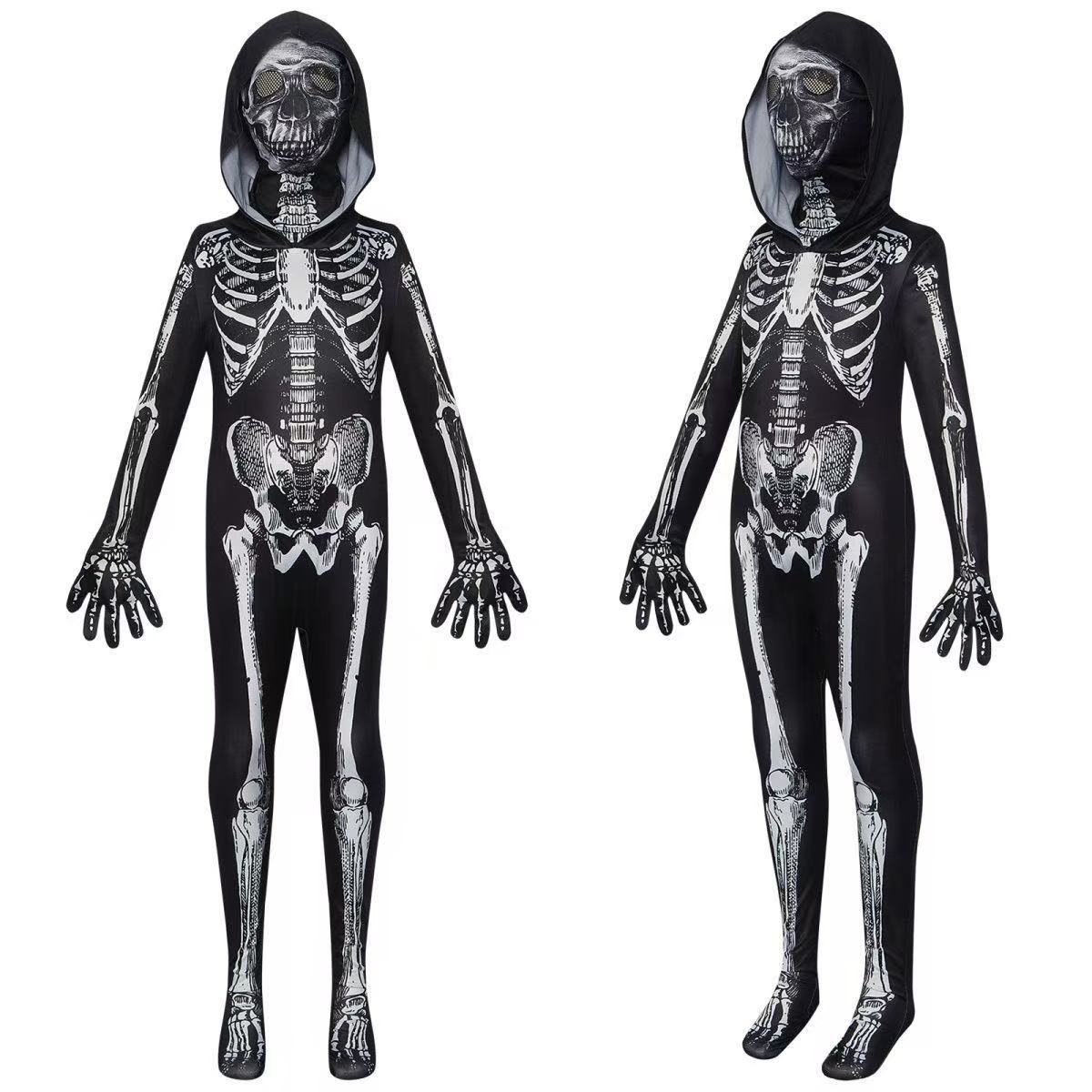 Transformeer jezelf of je kind in een angstaanjagend skelet met dit complete verkleedpak van Joya Kids®! Deze unieke skelet jumpsuit is gemaakt van superstretchy materiaal en bedrukt met een volledig wit skeletmotief op zowel de voor- als achterkant. Dankzij de geïntegreerde handschoenen, sokken en de meegeleverde skeletmasker met capuchon, ben je letterlijk van top tot teen een skelet. Perfect voor Halloween, carnaval, themafeestjes of spooky cosplay!