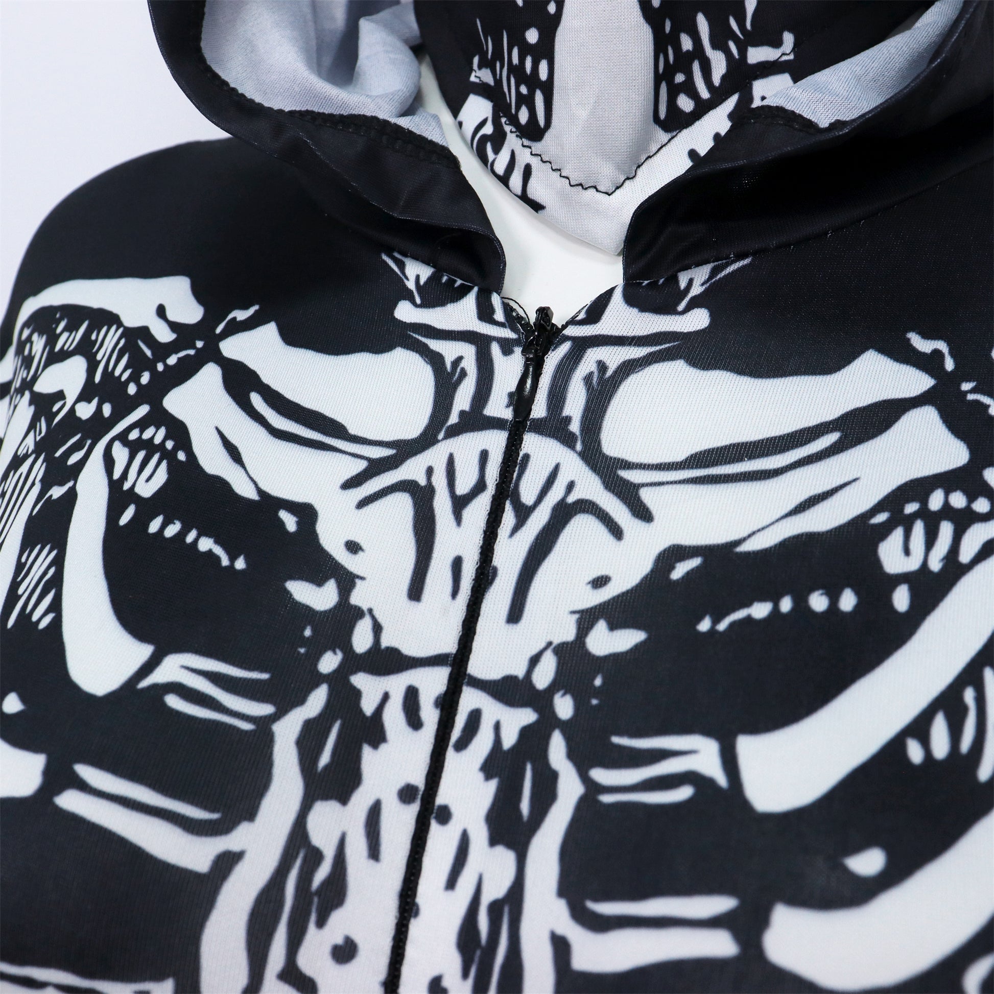 Grote capuchon met skeletprint en handige rits aan de voorzijde voor makkelijk aan- en uittrekken. -