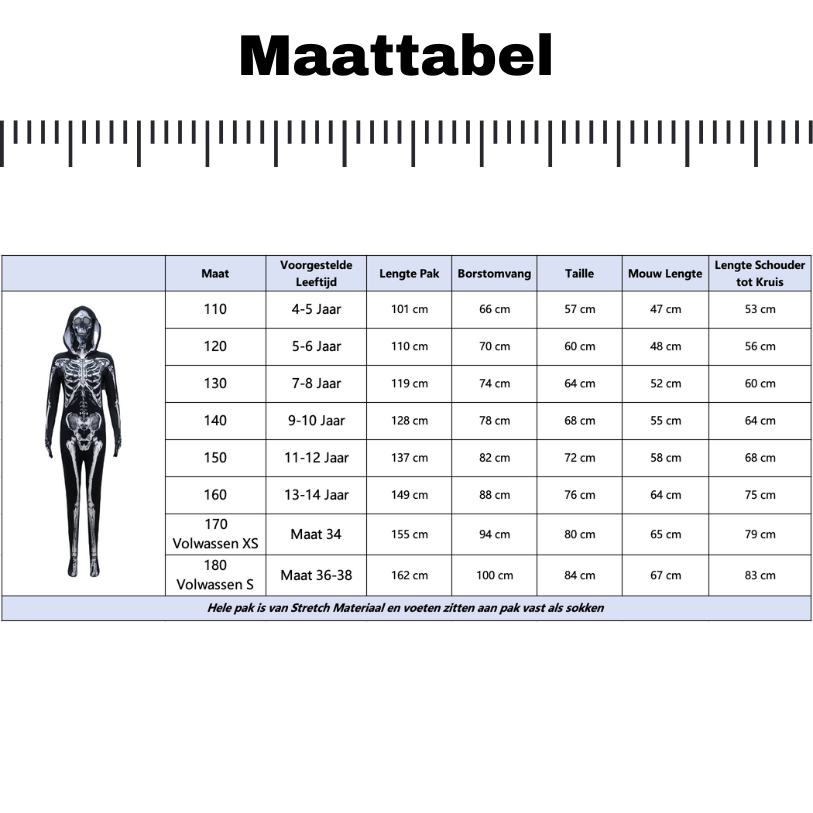 Joya Kids® Skelet Verkleedpak voor Kinderen & Volwassenen – Compleet Halloween Kostuum met Masker, Capuchon, Handschoenen en Sokken