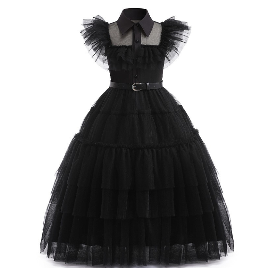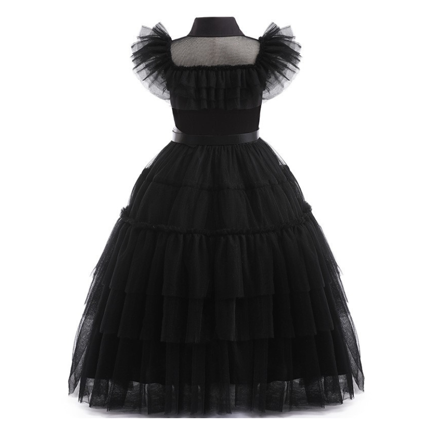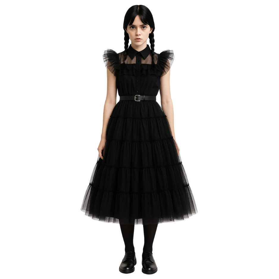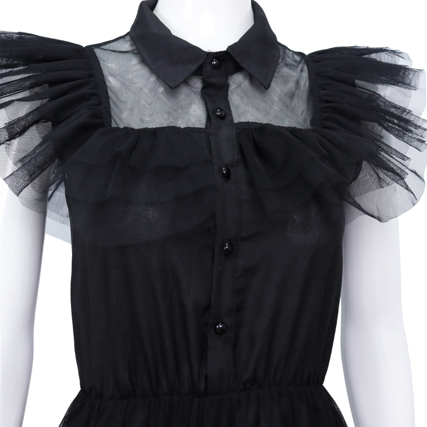 Deze jurk is gemaakt van een luchtige, gelaagde tule stof die speels over de enkels valt en prachtig meebeweegt bij elke stap met veel stretch. De transparante schouderpartij en geplooide mouwdetails geven de jurk een dramatisch effect, terwijl de klassieke kraag en de knoopsluiting zorgen voor een strakke, herkenbare Wednesday-look. De bovenkant is gevoerd met een zachte stof voor optimaal draagcomfort.