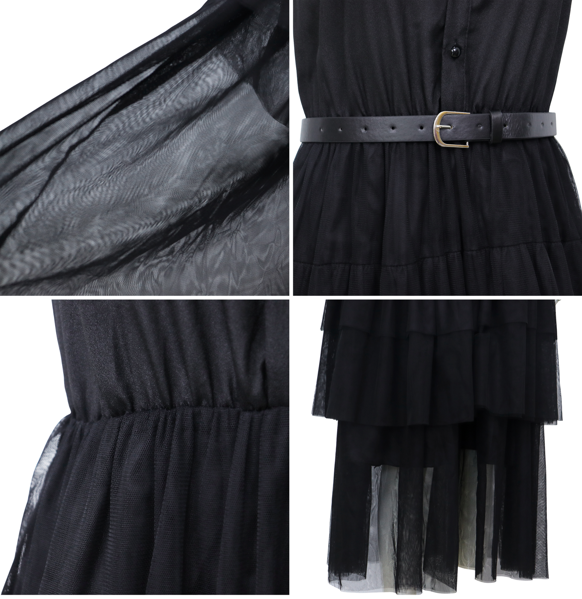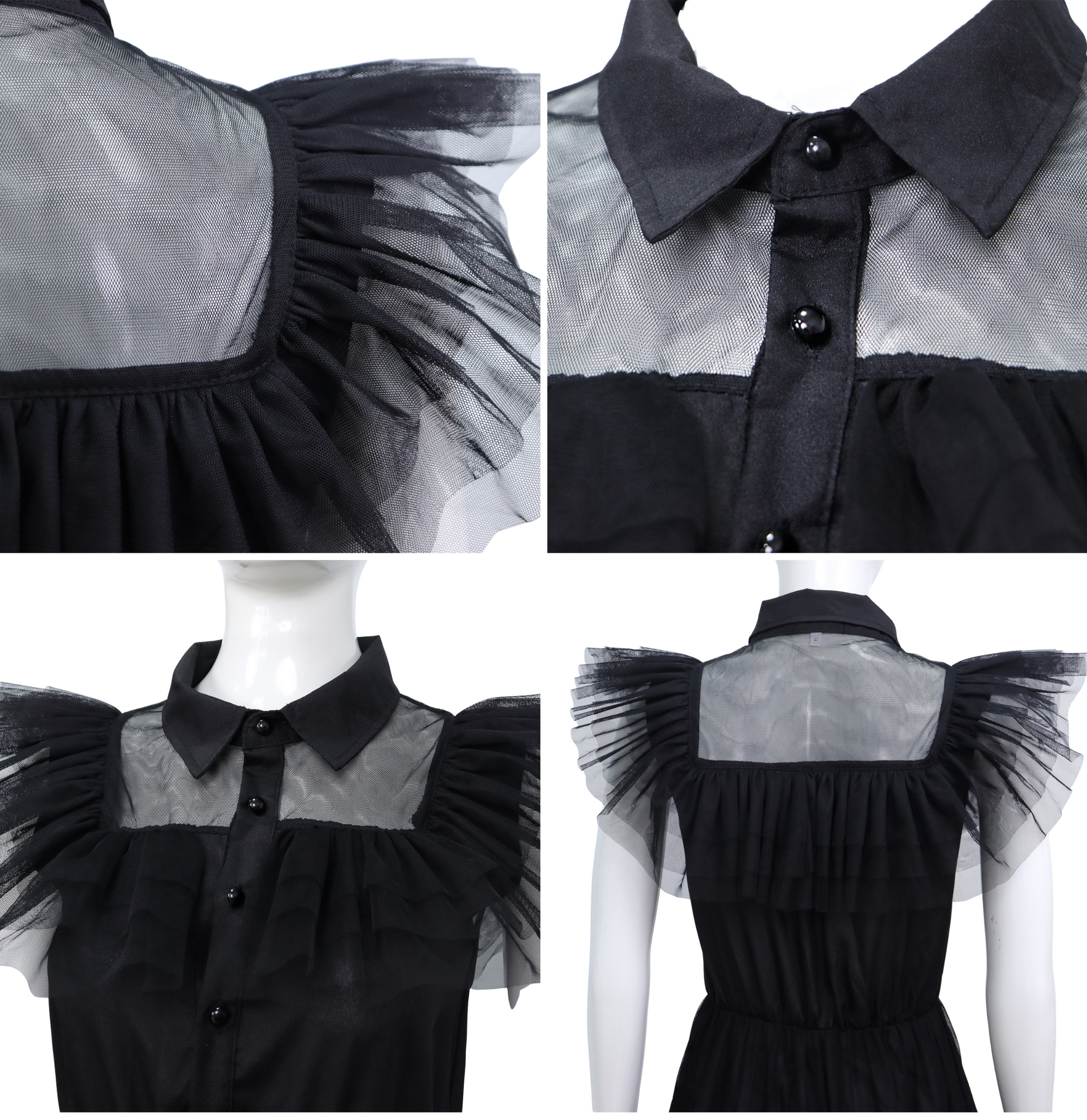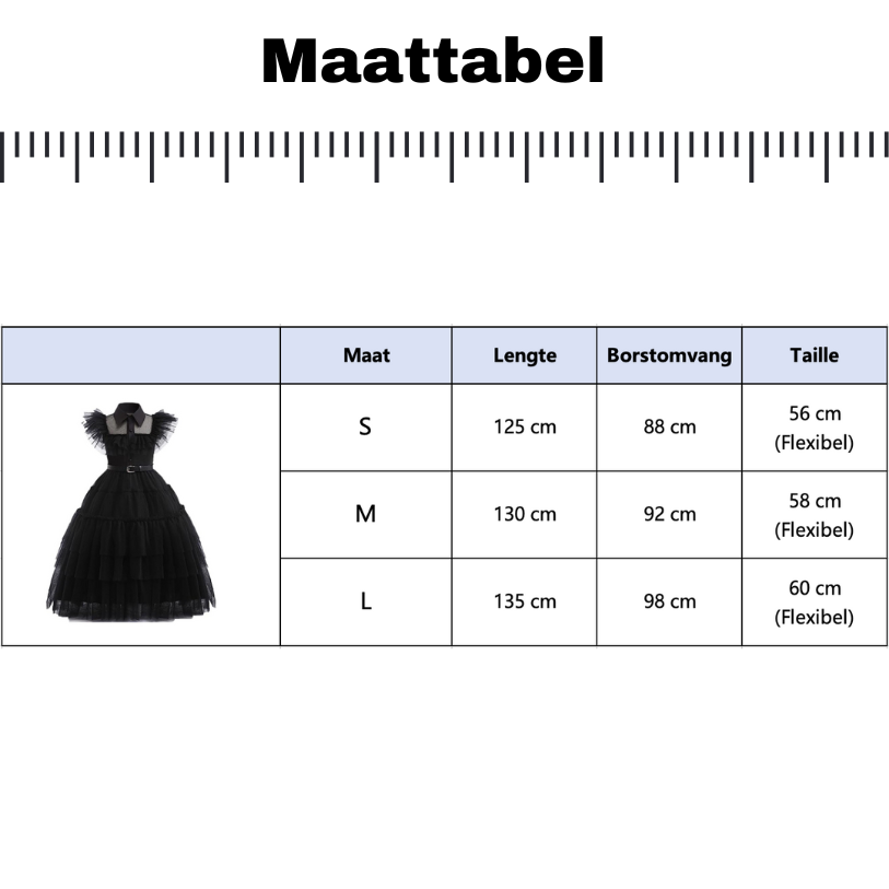 Deze jurk is gemaakt van een luchtige, gelaagde tule stof die speels over de enkels valt en prachtig meebeweegt bij elke stap met veel stretch. De transparante schouderpartij en geplooide mouwdetails geven de jurk een dramatisch effect, terwijl de klassieke kraag en de knoopsluiting zorgen voor een strakke, herkenbare Wednesday-look. De bovenkant is gevoerd met een zachte stof voor optimaal draagcomfort.