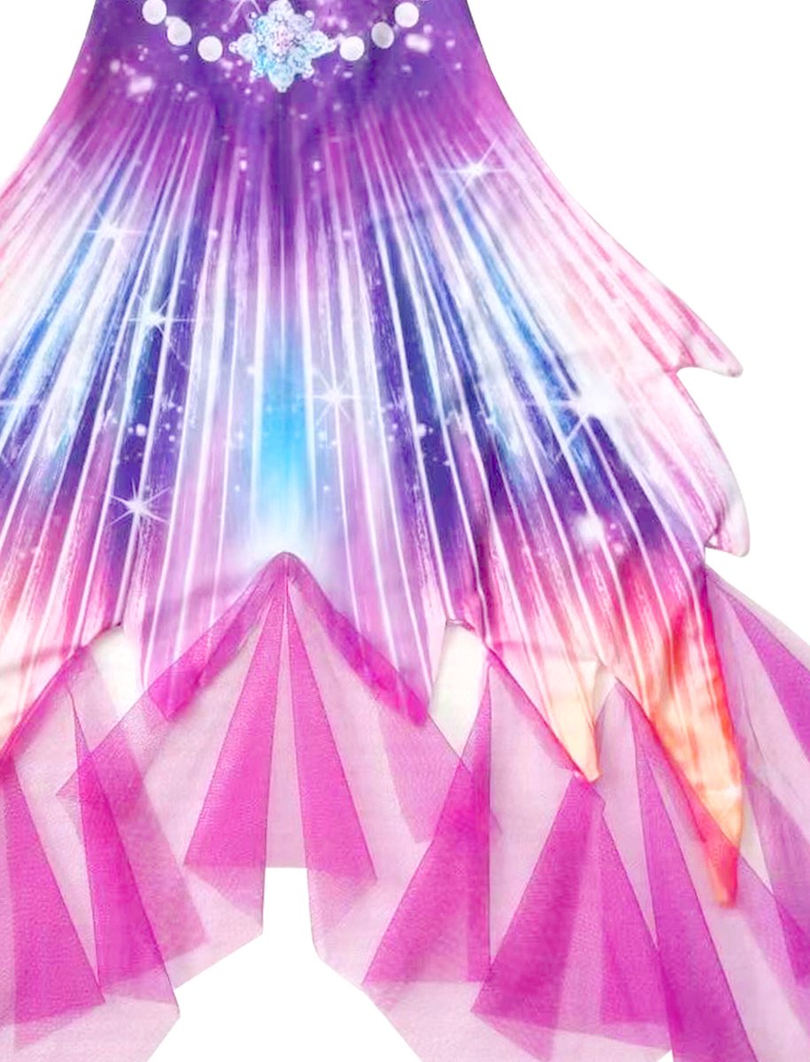 Complete Zeemeermin Set De set bestaat uit een schitterende zeemeerminnen staart met realistisch schubbenpatroon en mooie sieraad op de staart, een bikini topje met mooie rushes en een bikini broekje met elastische tailleband. Ook is de staart voorzien van prachtige tule franjes onderaan de staart en twee leuke zijschubben bij de heupen. De staart is geschikt voor het gebruiken van een monovin. Daarnaast heeft de staart een elastische taille voor een perfecte pasvorm. Let op, de monovin voor in de staart zit niet inbegrepen in deze set