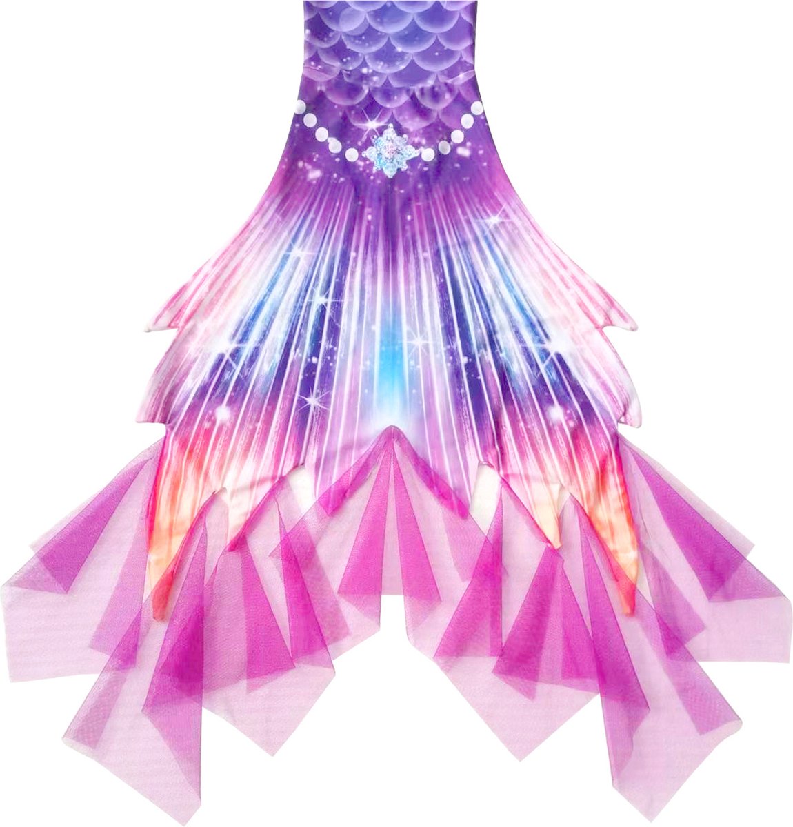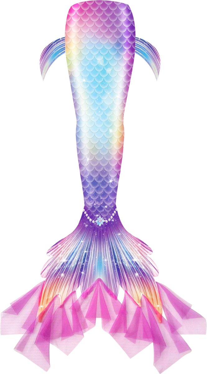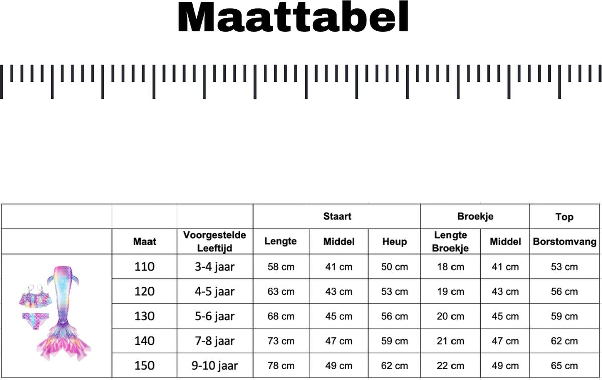 Complete Zeemeermin Set De set bestaat uit een schitterende zeemeerminnen staart met realistisch schubbenpatroon en mooie sieraad op de staart, een bikini topje met mooie rushes en een bikini broekje met elastische tailleband. Ook is de staart voorzien van prachtige tule franjes onderaan de staart en twee leuke zijschubben bij de heupen. De staart is geschikt voor het gebruiken van een monovin die inclusief in deze set wordt meegestuurd. Daarnaast heeft de staart een elastische taille voor een perfecte pasvorm.