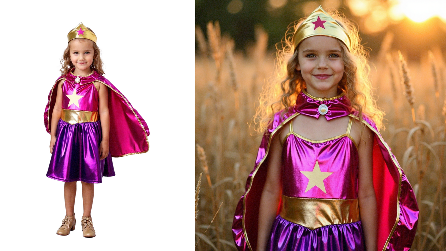 Metallic Superheldin Verkleedjurk met cape en kroon Roze & Paars